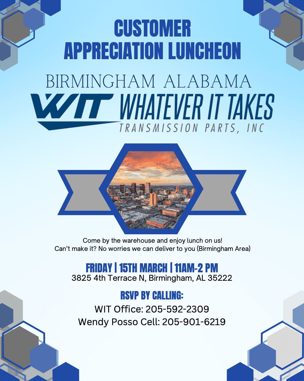“We are grateful for the support of our Birmingham area customers and want to show our appreciation by hosting this luncheon,” said Wendy Posso, a representative of Whatever It Takes Transmission Parts. “We look forward to spending time with our customers and showing them how much we value their business.”