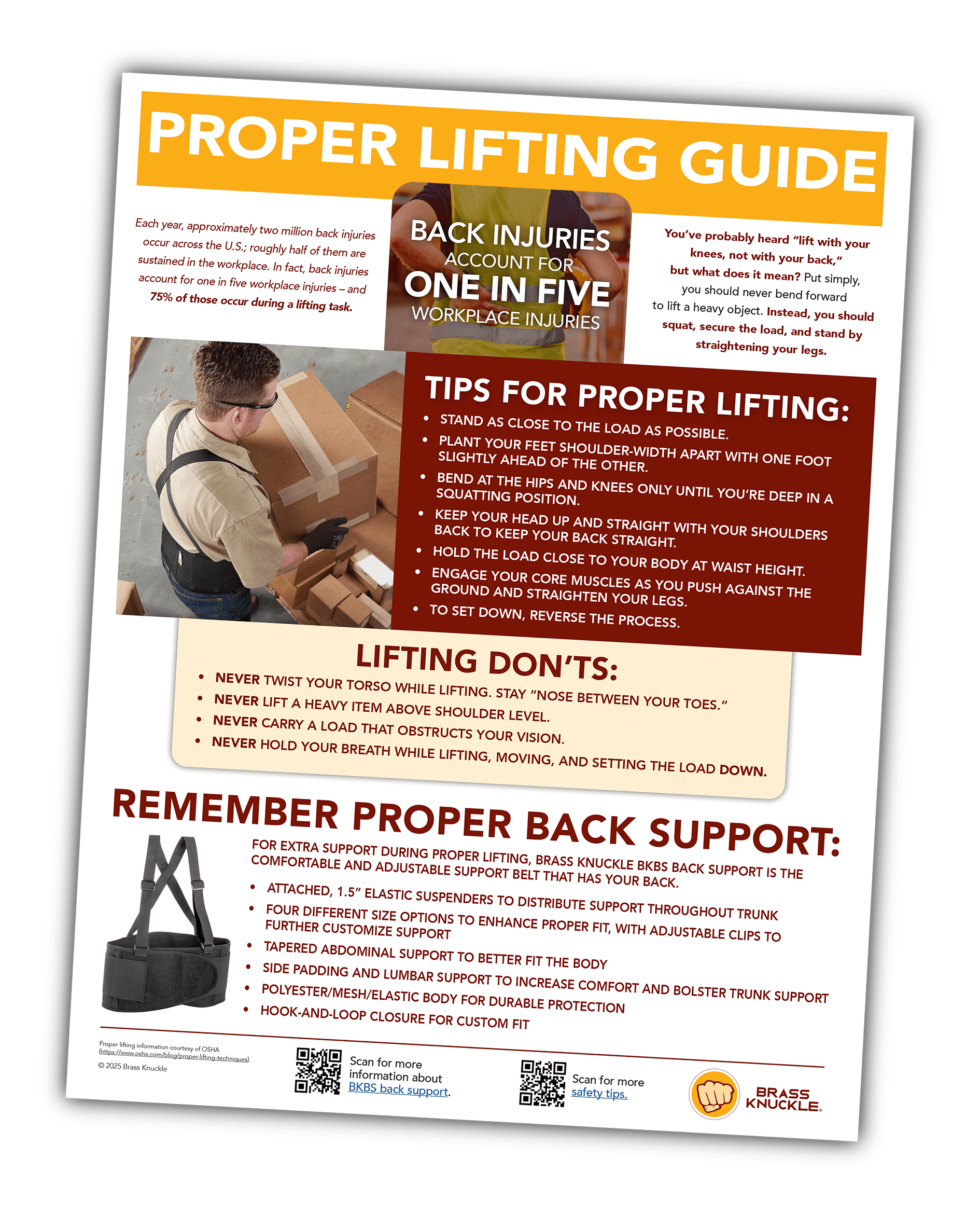 Proper lifting techniques – and proper back support, like the Brass Knuckle® BKBS – are vital to prevention. Employers have a stake in promoting proper lifting, as the consequences of back injuries are costly in workers’ compensation claims, days away from work, and lost productivity.