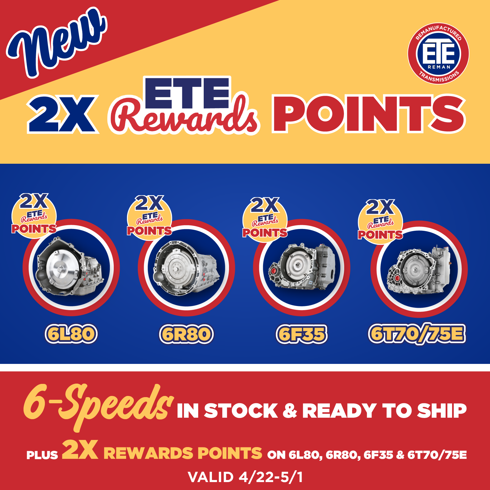 The ETE Rewards program is available to transmission specialty and auto repair shops. Current customers start earning points upon sign-up. New or returning customers taking advantage of ETE’s Switch to ETE promotion start earning on day 101 after the initial purchase date. Rewards may only be redeemed in increments of 10,000 points or more. Double points on 6R80, 6F35, 6T70/75E, and 6L80 promotion valid 4/22-5/1 for eligible shops. Double points awarded on ship date.