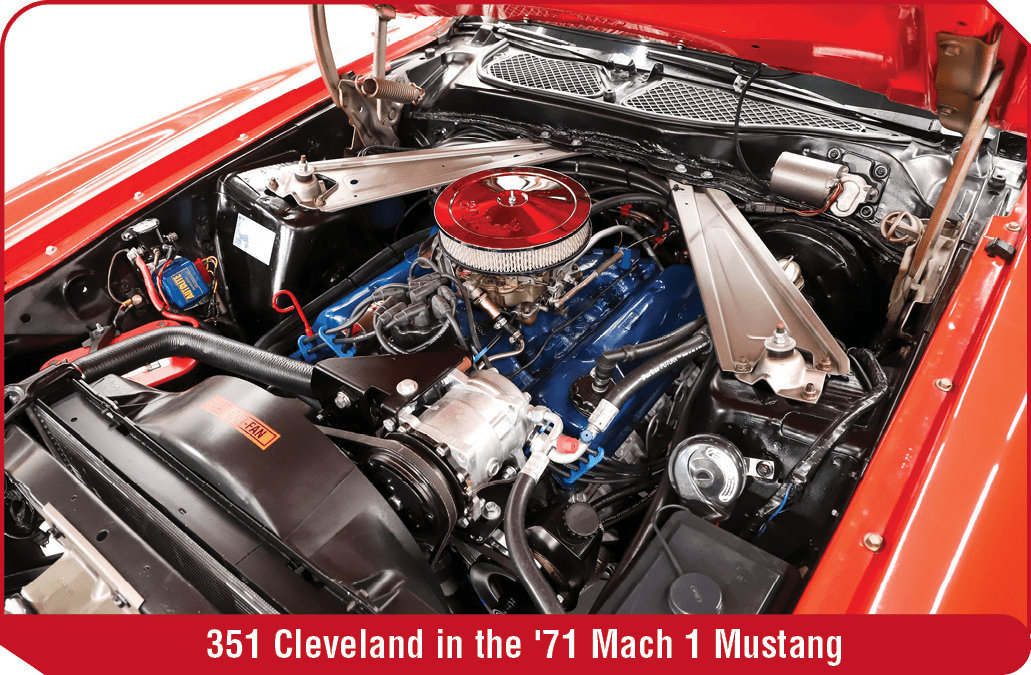 In 1971, the Mach 1 was available with several engine and transmission options, however, today we’ll focus on only one, the 351 Cleveland with a 4-barrel carburetor and a C6 automatic transmission. Power was rated at 300 hp with an impressive 385 lb-ft of torque. The engine was a big-budget undertaking for the Blue Oval group, in fact, on August 15, 1969, during the press release, Ford announced they would be introducing a brand-new $100 million engine designed for the 1970’s. The all-new 351 Cleveland was poised to become an automotive industry icon.