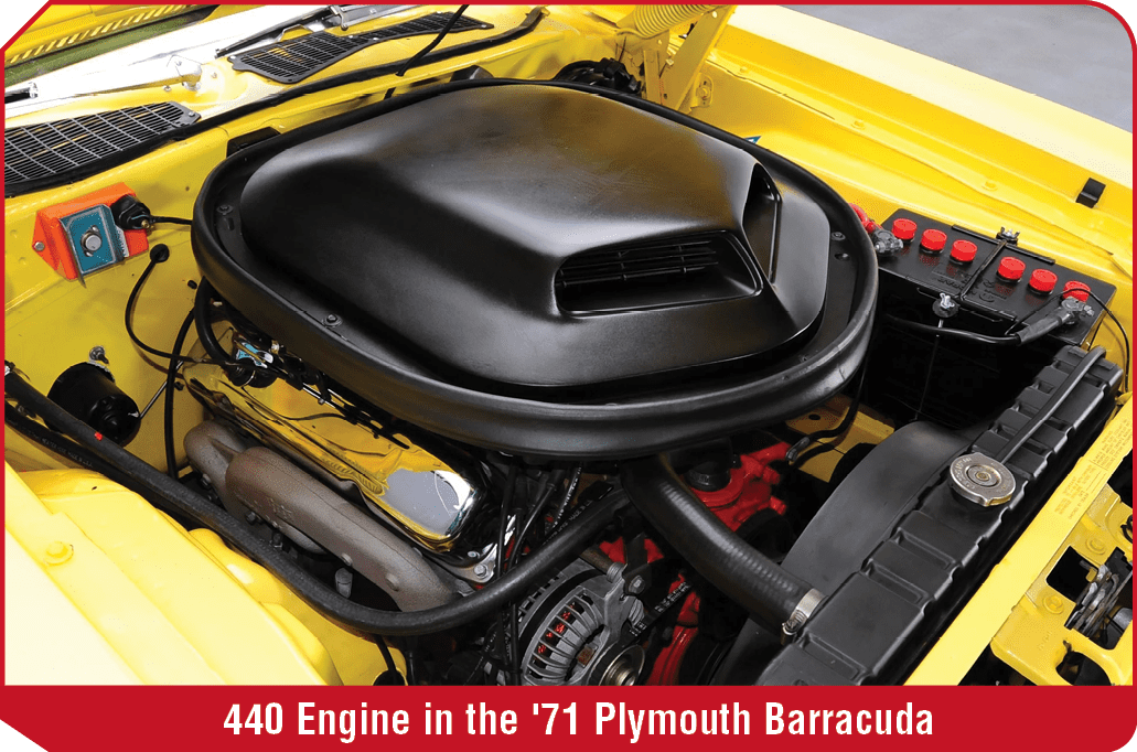 Amongst some of the coolest cosmetic additions for 1971 were huge graphics on the side of the car that displayed the engine size, a shaker hood, hood pins, rear window louvers, dual racing mirrors, and Rallye wheels. One thing was certain, there was no mystery concerning what a ‘71 Cuda’s intentions were.