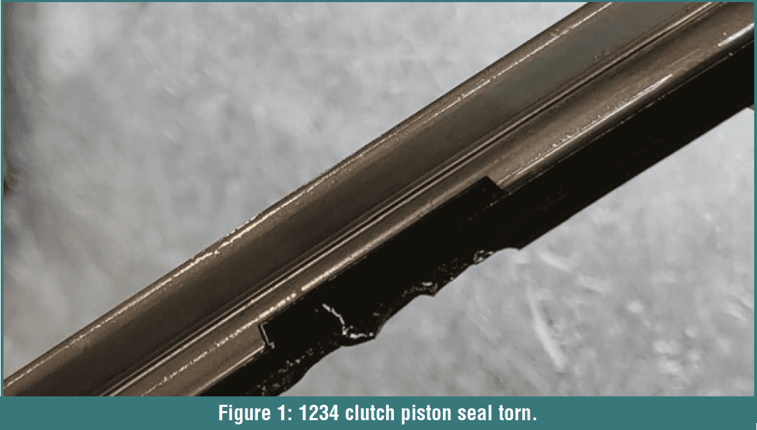 With the transmission disassembled on the bench, we inspected the 1234 clutch circuit. We checked the sealing rings and grooves for wear. We checked the 1234 clutch drum for any signs of cracks; there were none. We disassembled the 1234 clutch drum and found that the 1234 clutches were slightly burnt, and the piston seal was torn (Figure 1). We recommended overhauling the transmission due to mileage. We overhauled the transmission and installed it in the vehicle. After the installation, we test drove the vehicle several times, and the transmission seems to be working perfectly. We delivered the vehicle to the customer a couple of weeks ago, and he says the transmission has been working perfectly.