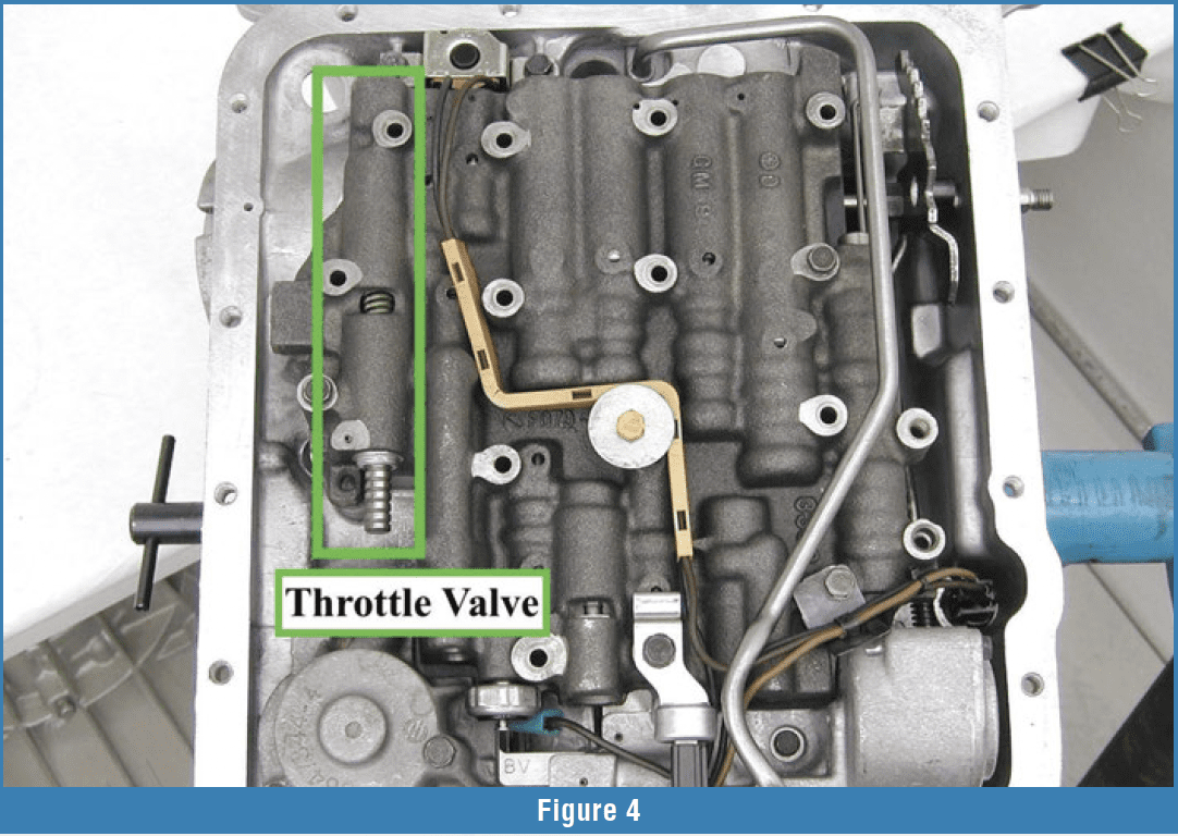 Two dominant designs were used: cable/linkage operated (Figure 4) or vacuum-controlled throttle valves. The vacuum-controlled valves used a “Vacuum Modulator,” which reacted to the intake manifold vacuum changes. As the load increased, the vacuum decreased, leading the modulator to push the valve further into the bore, increasing throttle pressure. The same was true of the cable/linkage-operated valves. As the throttle opening increased, the valve was pushed further into its bore, increasing throttle pressure.