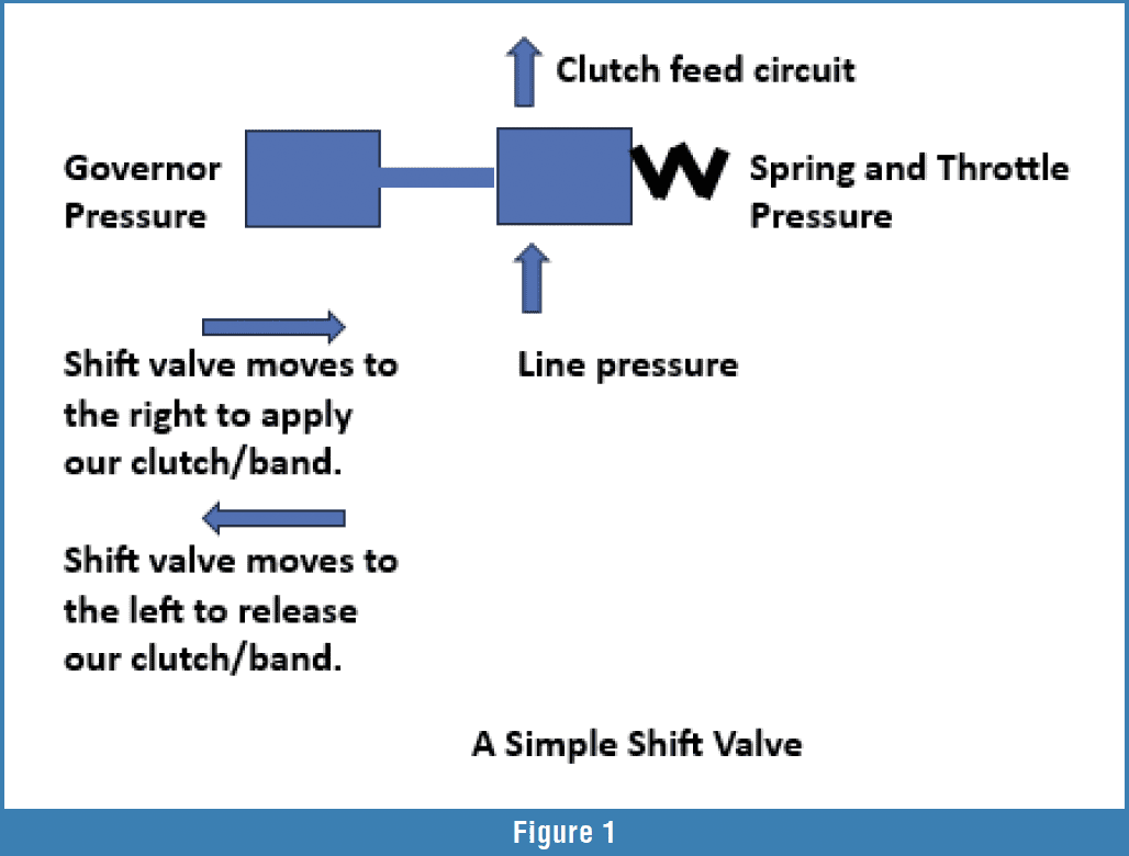 To make the transmission upshift, governor pressure must exceed the shift valve spring and the effects of throttle pressure, forcing the valve to snap into the upshifted position. This opened the shift valve passages to allow line pressure to travel through the valley of the valve to apply the clutch (Figure 1).