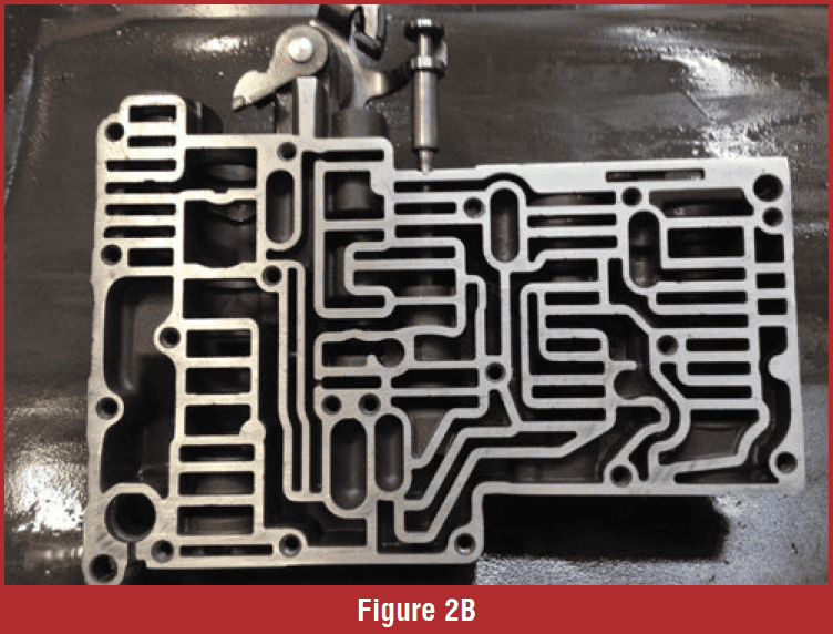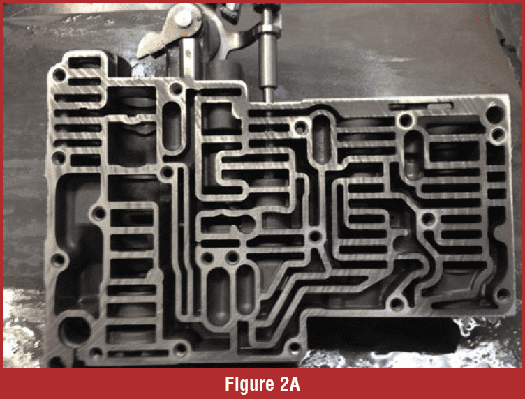 These valve bodies can always use extra tender loving care. Warpage from years of service is expected (figures 2A and 2B). The warpage causes pressure losses and control-oil leaks. Flat sanding is necessary to restore the hydraulic integrity of the valve body as best as possible.
