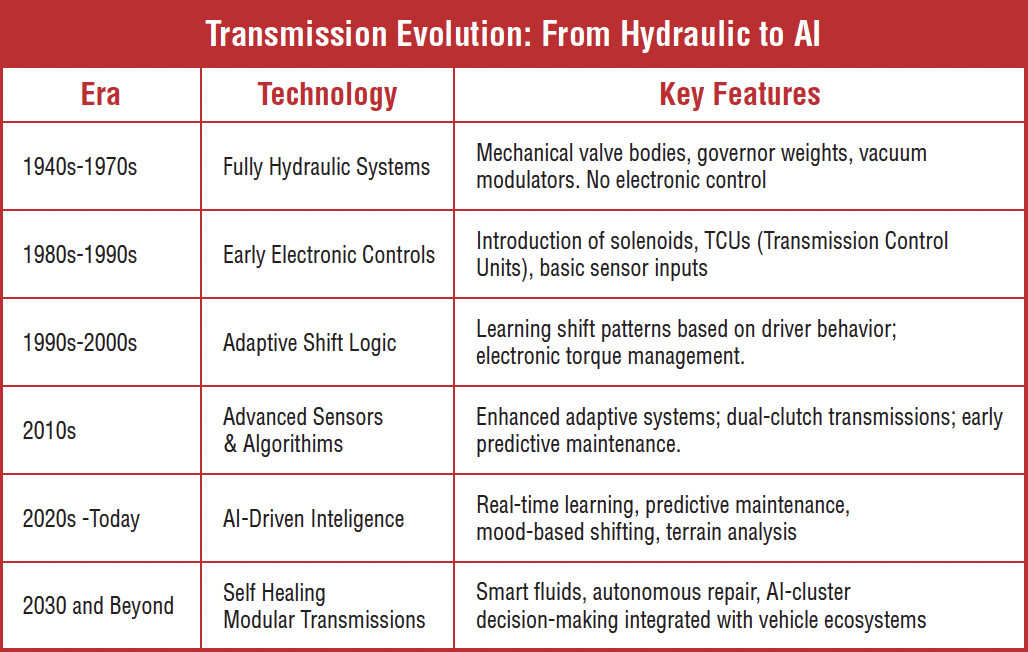 We are seeing evidence of this today with AI predicting future faults by analyzing minute changes in shift timing. For example, the program update that GM released just this year for the 10L series transmissions. With valve body wear causing abrupt upshift and downshift shifts, including gear train lock-up, the updated programming can now predict well in advance of when that failure will occur and change the shift pattern to prevent that failure. While certainly aggravating and annoying, to say the least, it is far better than the alternative of the vehicle coming to a very abrupt stop on the highway.