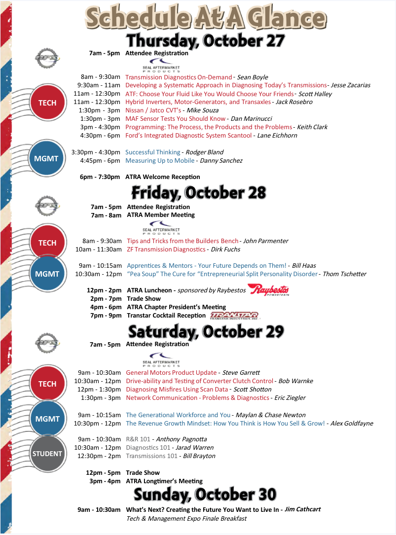 GEARS Staff Share This! Facebook Twitter Pinterest LinkedIn Powertrain Expo | June - 2016 ATRA’s Powertrain EXPO 2016 Schedule June 2, 2017157 Views You may also like On the Road | April - 2018 Bypass the TIPM to Test Code P0882 March 30, 2018David Chalker114,764 Views Delivering the Goods | July - 2020 TIPM Problems! Intermittent Fail Safe, Codes, Related Concerns and Solutions June 30, 2020Keith Clark112,805 Views Other Articles | September - 2020 The More You Know About The 10R80… The Better Off You Are! September 1, 2020GEARS Staff77,892 Views Other Articles | January/February - 2020 The ZF 8-Speed Transmission Fluid and Filter Change January 16, 2020Guest Author63,715 Views Share This! Facebook Twitter Pinterest LinkedIn More In Powertrain Expo Powertrain Expo | October - 2025 ATRA Powertrain Expo 2025 Wrap-Up: A Week of Learning, Networking, and Industry Growth GEARS Staff42 Views Powertrain Expo | August/September - 2025 ATRA’s 2025 Powertrain EXPO Exhibitor Directory GEARS Staff61 Views Powertrain Expo | July - 2025 ATRA Powertrain Expo 2025 GEARS Staff55 Views Powertrain Expo | June - 2025 ATRA’s Powertrain Expo 2025 GEARS Staff67 Views Powertrain Expo | May - 2025 ATRA Powertrain Expo 2025 Preview GEARS Staff66 Views Popular Columns ATRA +A+ Money MattersM Hi-RevM What's WorkingM Up Your BusinessM Shop ProfileM Back on the BenchT Keep Those Trannys RollingT Delivering the GoodsT Street SmartT Fun With TransmissionsT Other ArticlesO VIEW ALL Social Media