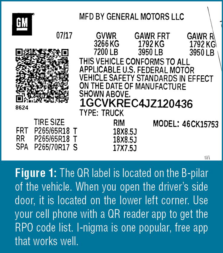 First, using the RPO code is the easiest way to identify the unit. Use your cell phone, equipped with a QR label reader app. Locate the QR label on the driver’s door B pillar, and use the phone app to display the label information (Figure 1).