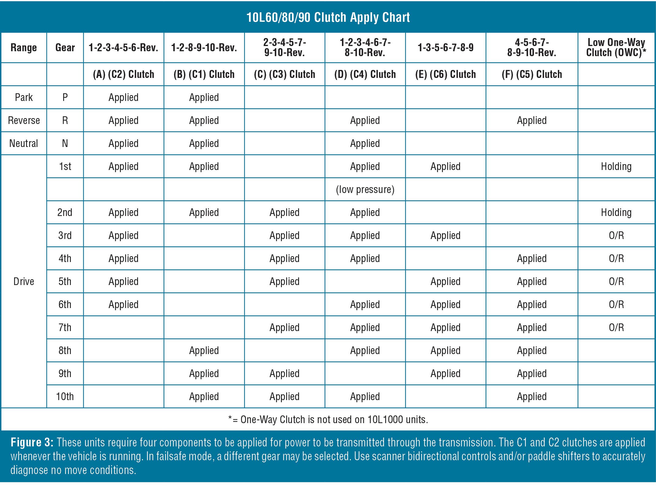 When diagnosing a no-move condition with these units, it is important to understand what is needed for power flow through the unit. Always refer to the clutch apply and solenoid apply charts (Figure 3). The 10L series transmission requires four components to be applied for power flow through the geartrain. Access your scanner’s bidirectional controls to command range changes to diagnose a no-move condition. You can manually command a second gear start using the paddle shifter for diagnostic purposes. Also, if the vehicle you are working on is a 4WD vehicle, selecting 4WD LOW will command a second-gear start, too.