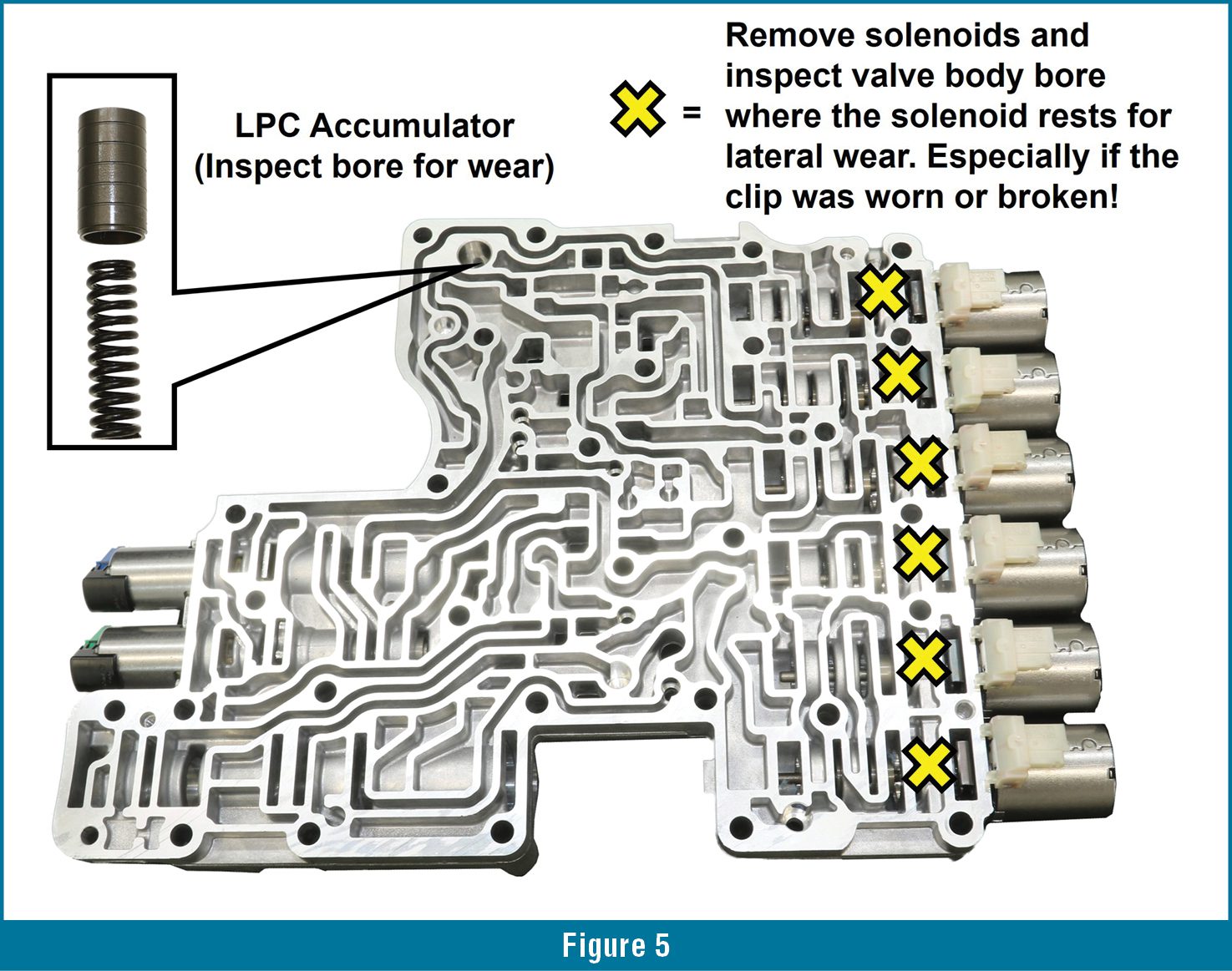 Inspect the valve body for wear in the LPC Accumulator bore and Linear Pintle solenoid bore areas (Figure 5). Note that wear in these areas requires the replacement of the valve body.