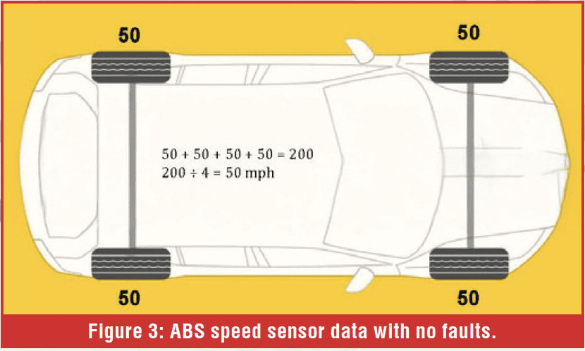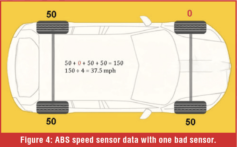 Why is there no speed sensor fault? It may be that sensor loss doesn’t occur long enough to qualify as a fault, yet that sensor’s data is still calculated into the batch data of all the wheel speed sensors. Or there’s EMI interference to the sensor. On a Toyota or Lexus vehicle, the P0500 may only occur after 5 seconds of signal loss. Let’s look at some simple math. On a vehicle with four-wheel speed sensors all reading 50 mph, the average of the four sensors is 50 mph (Figure 3). If one of those sensors loses signal and reads 0 mph, the average is now down to 37.5 mph. (Figure 4)