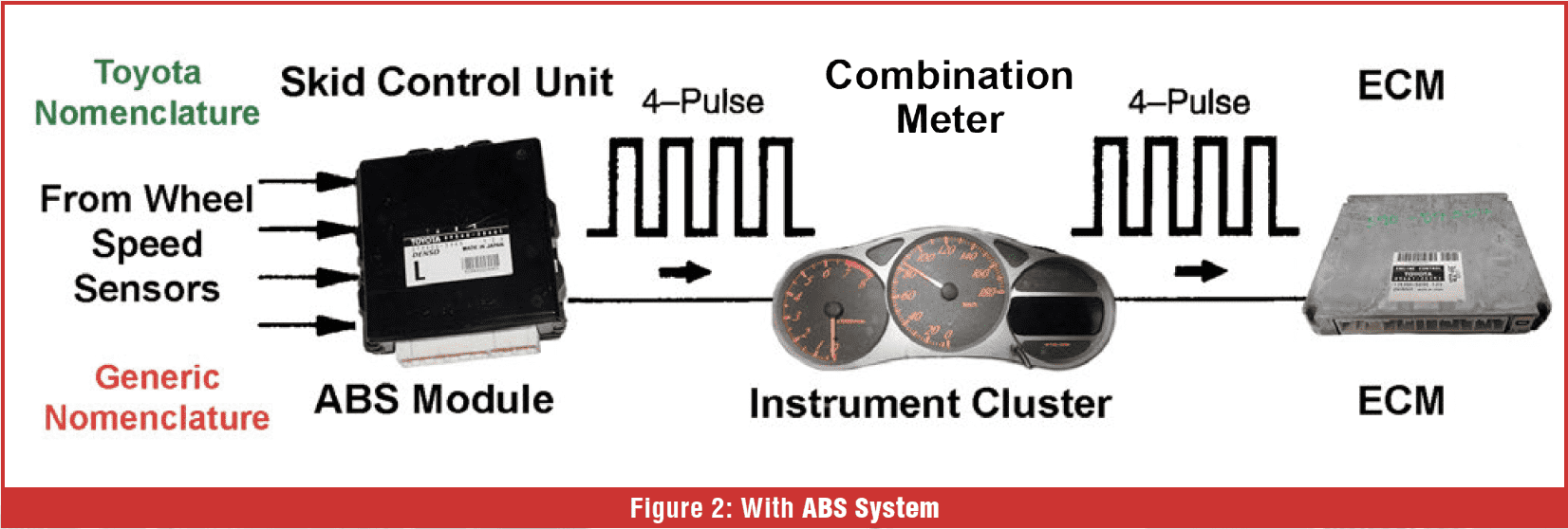Staying with our Toyota example, when a P0500 Vehicle Speed Sensor fault would set on these models, the most common assumption was that it was a failed speed sensor on the transmission. It was easy to get to and fix the problem on older vehicles, or those that didn’t have ABS. However, for the ABS-equipped models, (Figure 2) the instrument cluster, or combination meter, acquired vehicle speed from the ABS module, which obtained its information from the wheel speed sensors. Once the cluster received this VSS data, it then sent it out to the ECM and sometimes the TCM. The transmission output speed sensor data is sent to the ECM/TCM. That allows the ECM/TCM to compare vehicle speed data with OSS data. After crunching the numbers (including tire size and final drive ratio), it can interrogate the VSS data to confirm its validity. On these models, the P0500 DTC is telling us that the VSS data and the OSS data don’t align. Failure points can include wheel speed sensors, the ABS module, the Instrument Cluster, the ECM, or the OSS.