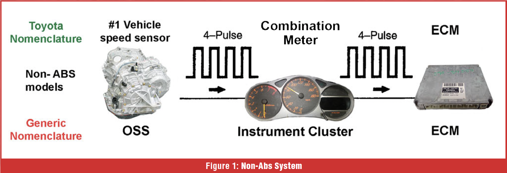 Let’s break down evolution a bit further. One of the early adopters of utilizing ABS wheel speed sensors was Toyota, using the wheel speed sensors to provide actual vehicle speed. The transmission still retained an output speed sensor. Still, instead of using that data to determine vehicle speed, it has now become the data against which the vehicle speed sensor (ABS) data is checked, as well as gear ratio monitoring. Note that on those early models, the vehicle may or may not have ABS. On those with no ABS option, the OSS on the transmission was the VSS source. (Figure 1).