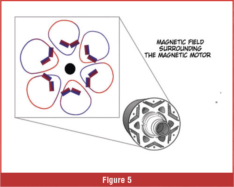 Conventional transmissions must provide a range of gear ratios to achieve the desired torque output and a speed of 100 mph or higher. An EV can provide the desired torque and obtain speeds of 100 mph with a single-speed transmission. What makes this possible is that the three-phase motor develops maximum torque as soon as it rotates. It maintains that torque until it reaches approximately 6,000 RPM (Figure 2). Electric motor torque is directly related to supply voltage. Increasing the supply voltage will increase the motor’s torque. You could say motor torque is controlled by the voltage supply, and the voltage frequency controls motor speed. Gasoline engines develop torque on a curve; the torque starts to develop at a lower RPM and continues to increase until max torque is reached. With many engine families, this may be in the 4,000 RPM range and will start to diminish based on volumetric efficiency (VE). Electric motors start to lose torque based on back electromotive force (EMF). Electrical training has taught us that when a magnet is spun inside a coil of wire, it produces a voltage.