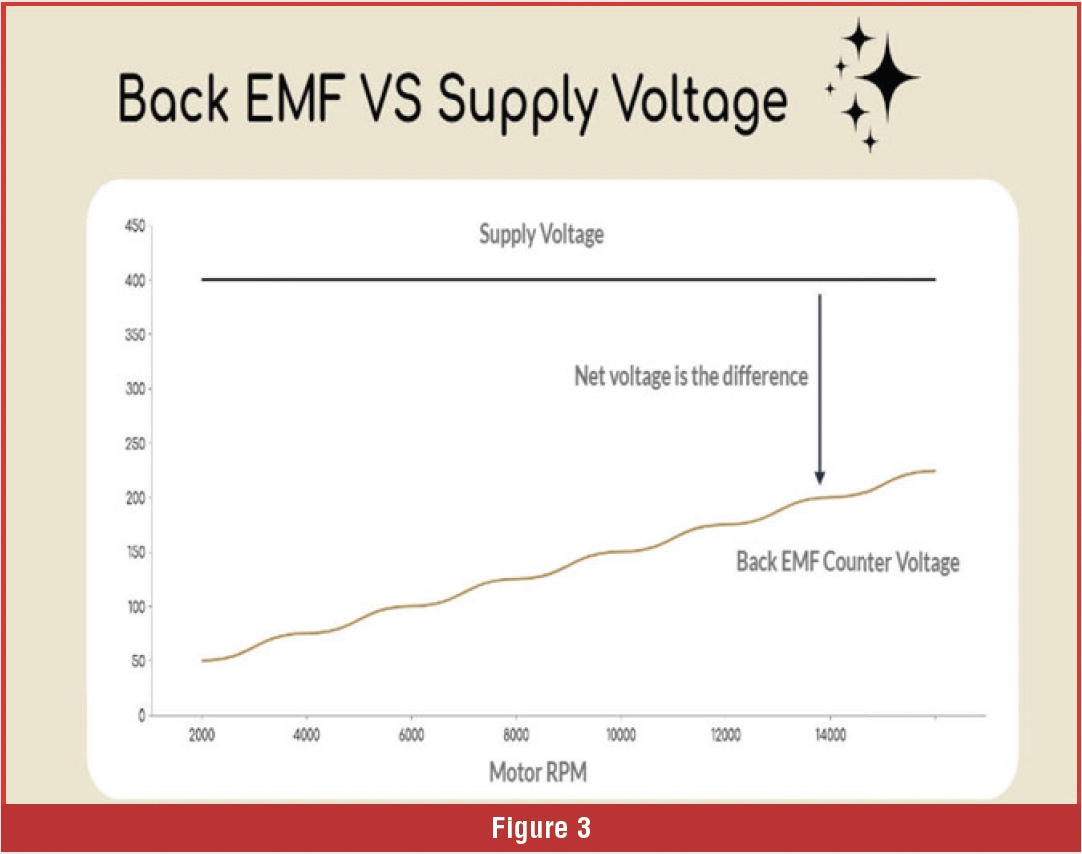Electric motors start to develop a counter voltage, known as back EMF, as the magnetic rotor begins to spin inside the stator, which is a coil of wire. The voltage that it produces by the rotor counteracts the supply voltage. For example, if the back EMF created by the motor were 200 volts and the supply voltage were 400 volts, you would end up with a net voltage of 200 (Figure 3). The net voltage is what is left to drive the motor. As the net voltage decreases, the torque of the electric motor decreases. Electric motors are way more efficient from 0 to 6,000 RPMs than they are from 6,000 RPMs and up. The higher the supply voltage, the more back EMF you can handle, which is possibly why the industry is moving from the 200-400 volt batteries to an 800 volt battery.