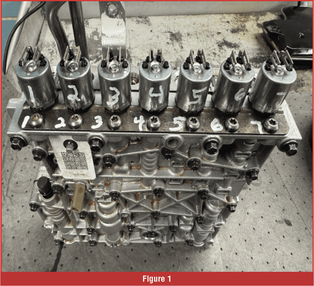 Conventional gasoline vehicles used gear trains to provide a torque multiplication and also provide low, medium, and high speeds for the vehicle. Conventional vehicles of the past had only two speeds, whereas modern transmissions now have up to 10 speeds. Why do we keep adding gears to the transmission? A couple of contributing factors are that we can keep the engine in its torque band when we need maximum torque, and we can increase fuel mileage by lowering the engine’s RPM. Transmissions on the way to 10 speeds became increasingly sophisticated, and they became larger due to the addition of more parts. Let’s turn our attention to the electric vehicle. Most of us would consider an electric vehicle (EV) a sophisticated piece of machinery. When we look at the transmission, we find that most electric vehicles have only single-speed gearboxes. How is that possible when its gasoline counterpart has 6-10 speeds? As stated previously, gasoline models must keep the engine within its torque range while allowing the vehicle to travel at varying speeds. Let’s look at how many solenoids are used on a 6R140 with only six speeds and lockup (Figure 1).