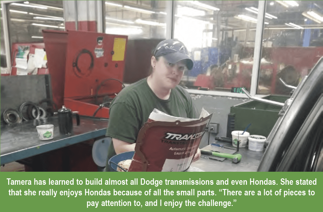 Tamera has learned to build almost all Dodge transmissions and even Hondas. She stated that she really enjoys Hondas because of all the small parts. “There are a lot of pieces to pay attention to, and I enjoy the challenge.”