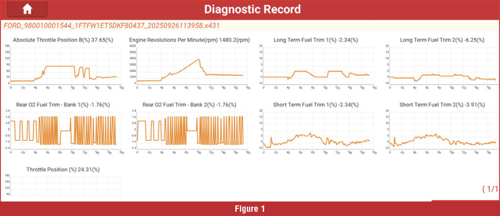 Long-term fuel trims act as a watchdog for short-term fuel trims. If short-term fuel trim starts to work too hard or travel outside a predetermined window, long-term fuel trim will correct the base pulse width to bring short-term fuel trim back to its normal range. Longterm fuel trim corrections are stored in memory load cells. We must drive the vehicle through these load cells and record long-term fuel trim corrections. We cannot just look at fuel trims at idle. Rear fuel trim originates from the rear O2 sensor. The rear O2 sensor, located behind the catalytic converter, monitors the converter’s intake of oxygen to ensure it receives the correct amount, promoting optimal catalyst life. Rear fuel trim contributes approximately a 2% correction to fuel trims under normal conditions; however, we have observed that rear fuel trim has significantly more authority when things are not functioning correctly. Total fuel trim is simply the sum of short-term, long-term, and rear fuel trim. Total fuel trim is applied to the base pulse width to ensure the correct amount of fuel is delivered. Some manufacturers may have a PID for total fuel; however, if not, you can perform the calculation yourself. In Figure 1, you can calculate the total fuel trim for each bank.