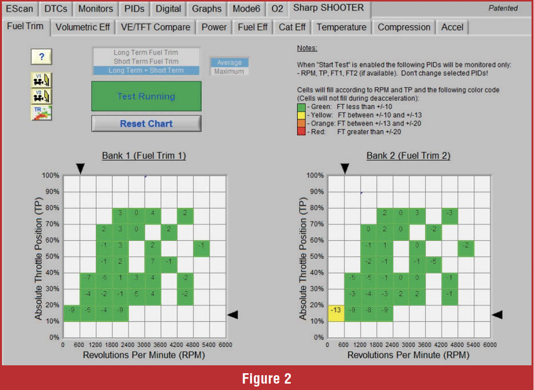 There is a generic scan tool that offers a different way to view fuel trims. The scan tool software features a block diagram chart that utilizes throttle position and RPM as its axes. The scan tool allows short-term and long-term fuel trims to be added together, and the results are plotted onto the chart. The vehicle must be driven through different load cells to fill up the chart. See figure 2.