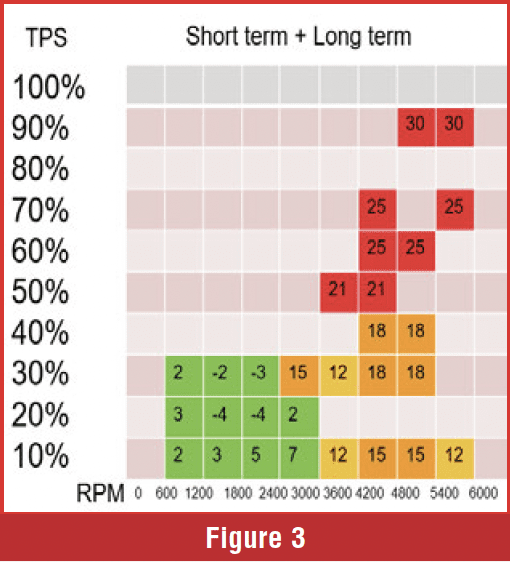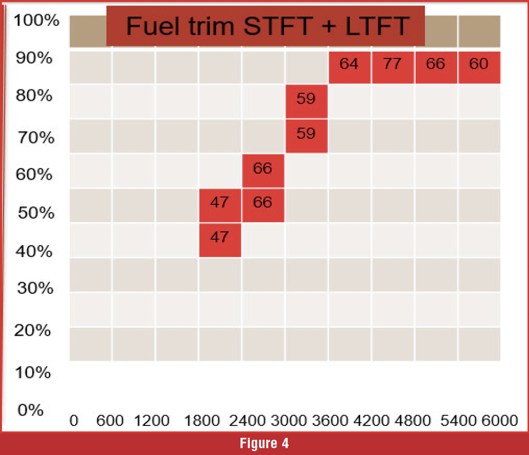 The basic idea of using fuel trims as a diagnostic tool means we must view them over all load ranges. If fuel trims are high, meaning we are adding a lot of fuel, it means the base pulse width calculation may be wrong due to a load calculation error, or we have a fuel pressure/volume issue. How can we distinguish between the two? Typically, fuel pumps that produce sufficient volume result in high fuel trims in moderate to heavy load cells, but do not cause issues in low-load cells unless the fuel pump is severely malfunctioning. If the air measurement were undercalculated, the fuel trims would be affected across the board. Figure 3 illustrates how fuel trims would appear with a low-volume fuel pump.