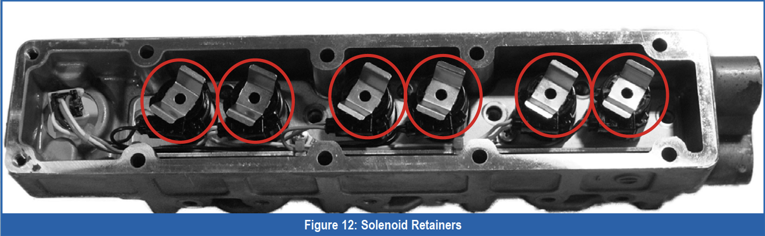 There are six solenoids that execute the shifting operations. These solenoids are PMW controlled by the computer for a smooth shifting transition between the gears (Figure 11). The solenoids resistance is 4 ohms to 6 ohms, across the board. Each solenoid has a pressure retainer on top (Figure 12) that secure the solenoids once the cover is in place.