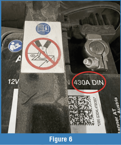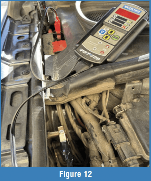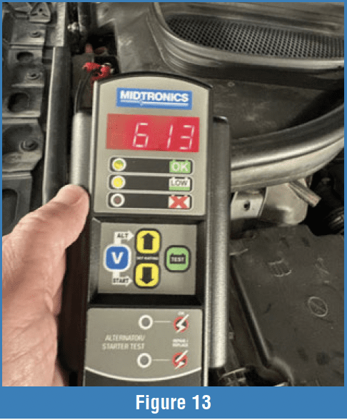 The next battery is rated at 850 CCA. Unfortunately, this battery is located under the passenger seat, so getting a rating was a mild inconvenience. Don’t be surprised to find this. Over time, you’ll become accustomed to knowing how to get to the battery. For vehicles like this, go to the remote battery posts for the tests (Figure 12). I went through the setup (as before) by holding the test button while connecting the tester. Pressing the “Up” arrow, I scrolled from the previous DIN setting to CCA. And like the first vehicle settings, the tool has either 840 or 860 CCA. I set the tester to 860 and made the test. It returned with 613, a green “OK” LED, and a yellow “Low” LED (Figure 13). This means that it considers the battery in good shape but low on voltage. Charge the battery, and then continue with the remainder of the voltage tests. If the conductance test had returned with just the yellow LED, the tester is unsure of the battery’s condition. A result like this is likely on a vehicle that’s sat for a long time. The battery could be okay, but it’s just low on charge. A traditional load test would fail this battery, so it’s not a bad result. If you don’t get a solid green after fully charging the battery, replace it. But remember, if the battery is overcharged, you’ll get a RED failure. That was the case with this test vehicle after charging the battery. Once I got the voltage around 12.6, it passed.