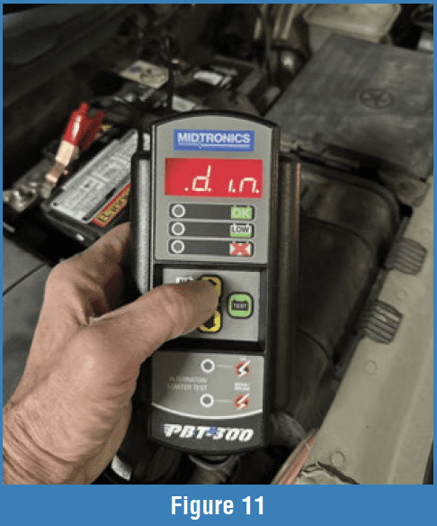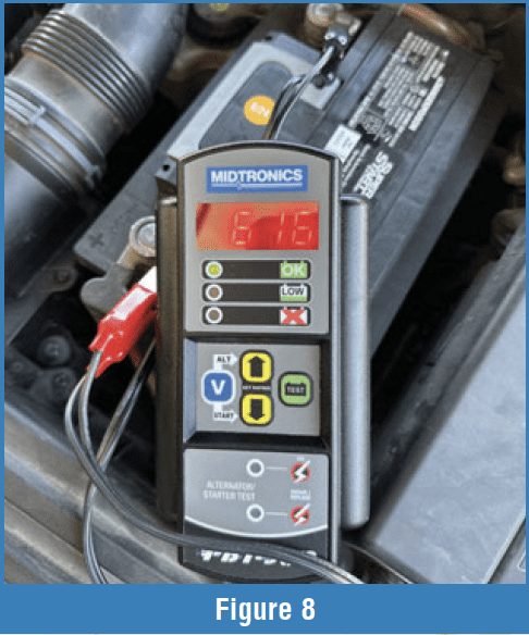 Press the down arrow, and the tester displays the stored cranking voltage. Our example showed 10.68 V. It also shows a green (OK) LED on the testing panel (Figure 9). Had the meter read an excessive drop in voltage, it’d illuminate the Red “Repair/Replace” LED.