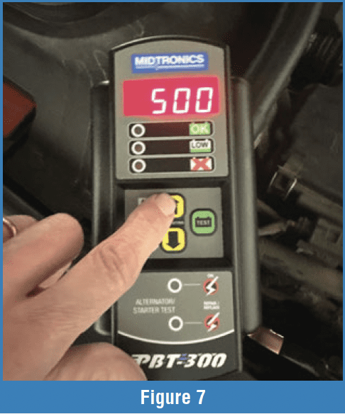Step 2, Testing the Battery’s Condition: Connect the tester to the battery. This tester defaults to 500 CCA (Figure 7). Press the up arrow to increase the CCA setting or down to lower it. Once you have the right setting press the test button. You’ll see the tester lights work (like it’s thinking) and then display a number showing how close the battery came to operating at that rating. In our first example, we tested a battery rated at 650 CCA. Unfortunately, the tester only provides a setting of 640 or 660. We’ll select 660 CCA.