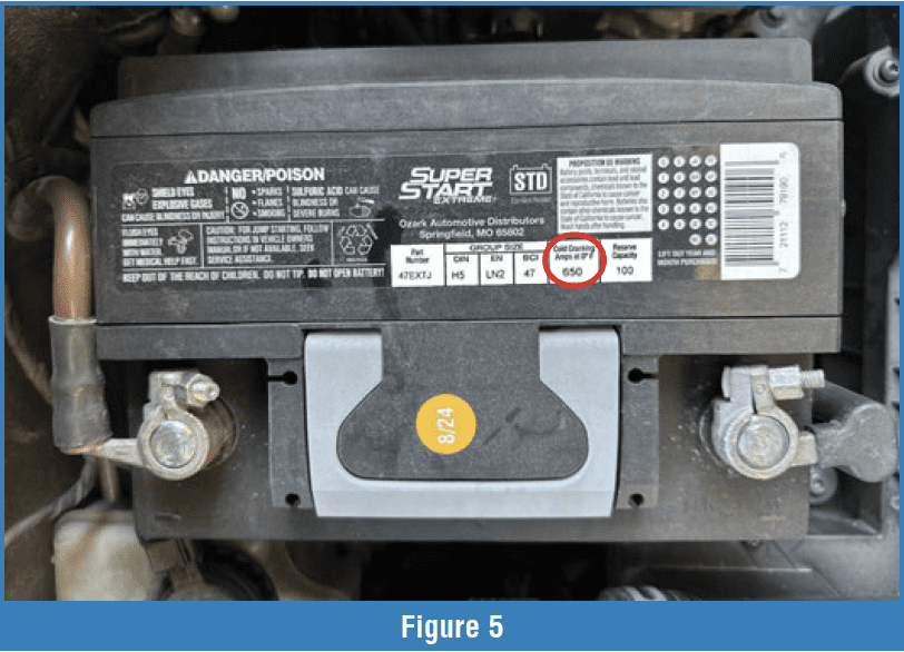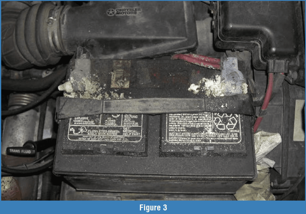 Before you begin: Make sure the battery is clean and the cables are in good condition. If the battery and terminals look like the example in Figure 3, correct these conditions before testing the battery. If you’d like to test a battery in this condition, you can isolate it from the vehicle by removing the cables and following the conductance test outlined in steps 1 and 2. If the battery tests okay, clean the cables and any connections and continue with step 3.