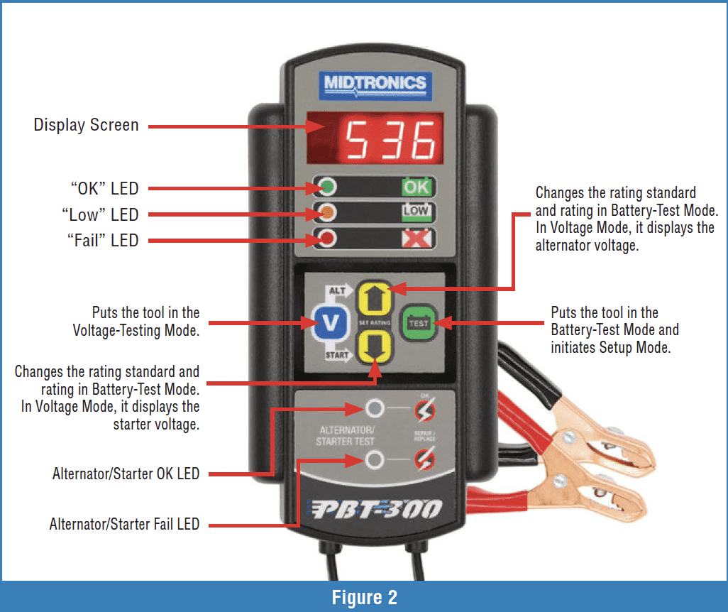 You can find a range of conductance testers on the market. Mine happens to be the Midtronics PBT-300 (Figure 2). It costs about $300 and is great for personal use. Notice the caption, which points out buttons and lights. We’ll refer to them later. They make other models with features like 24-volt testing and a built-in printer. The printer allows you to give your customer the results of your test.