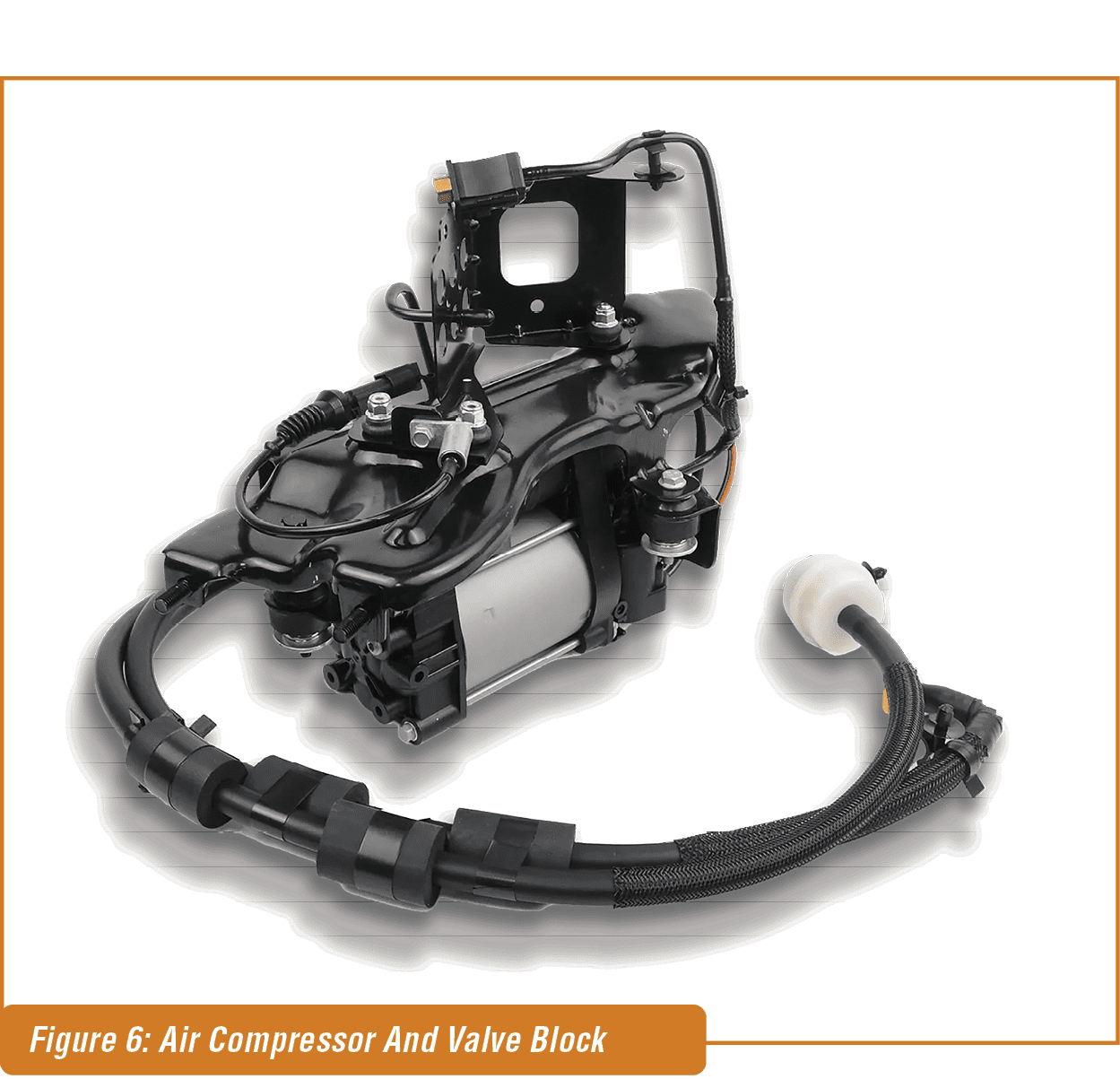 The compressor and valve body assembly can also be a common point of failure. Warning lights will generally indicate a failure; however, other signs may also be present, such as uneven ride height, excessive noise, or a lack of response when adjusting the ride height.