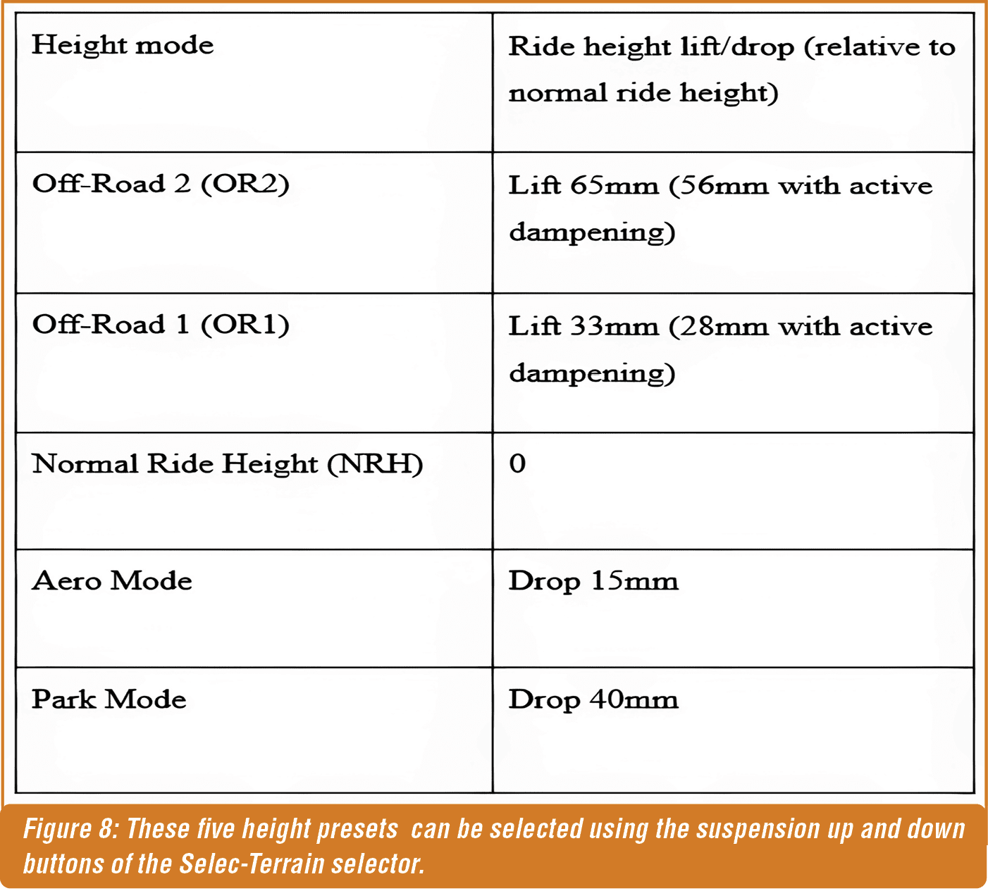 In manual control, there are five height presets (Figure 8) that can be selected using the suspension up and down buttons: Normal Ride Height (NRH), Off-Road 1 (OR1), Off-Road 2 (OR2), Aero mode, and Park mode.