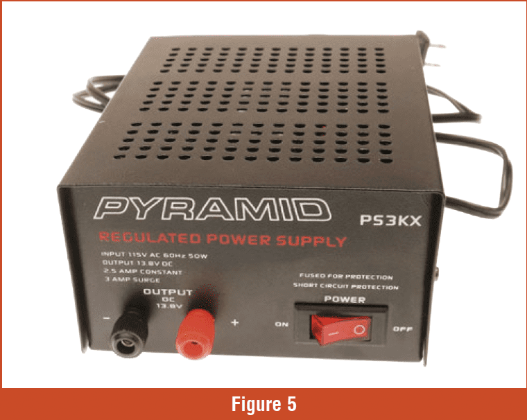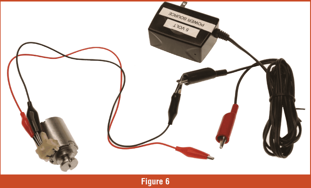 The other option is a 12-volt power source (Figure 5). This unit comes in handy when testing other solenoids with higher resistance. Be careful with the 12-volt power source. Do not leave the solenoid hooked up for any length of time. The solenoid will get very hot!