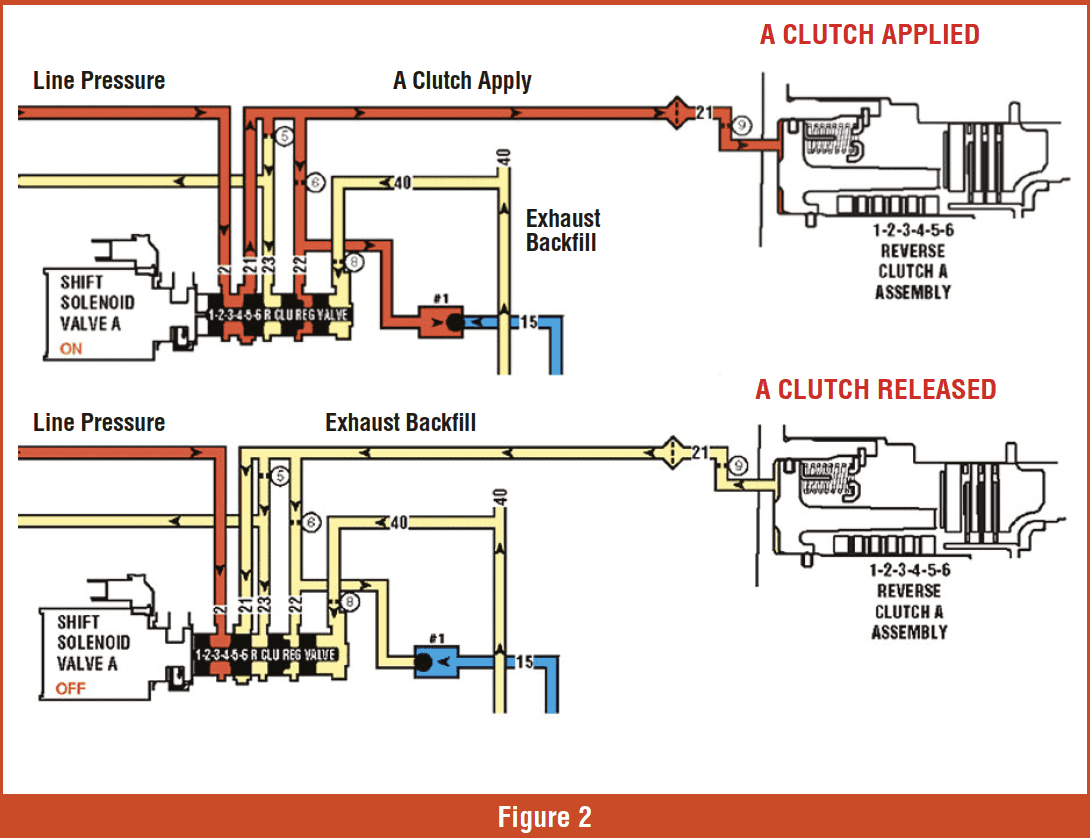 When the solenoid is powered up (figure 2, upper schematic), the pintle extends and pushes the valve to the right, opening the valve to line pressure to apply the clutch. This is a Pulse Width Modulated (PWM) solenoid, so the computer controls the clutch application time rate. When the solenoid is off (figure 2, lower schematic), the pressure on the right side of the valve pushes the valve and the pintle towards the solenoid to release the clutch.