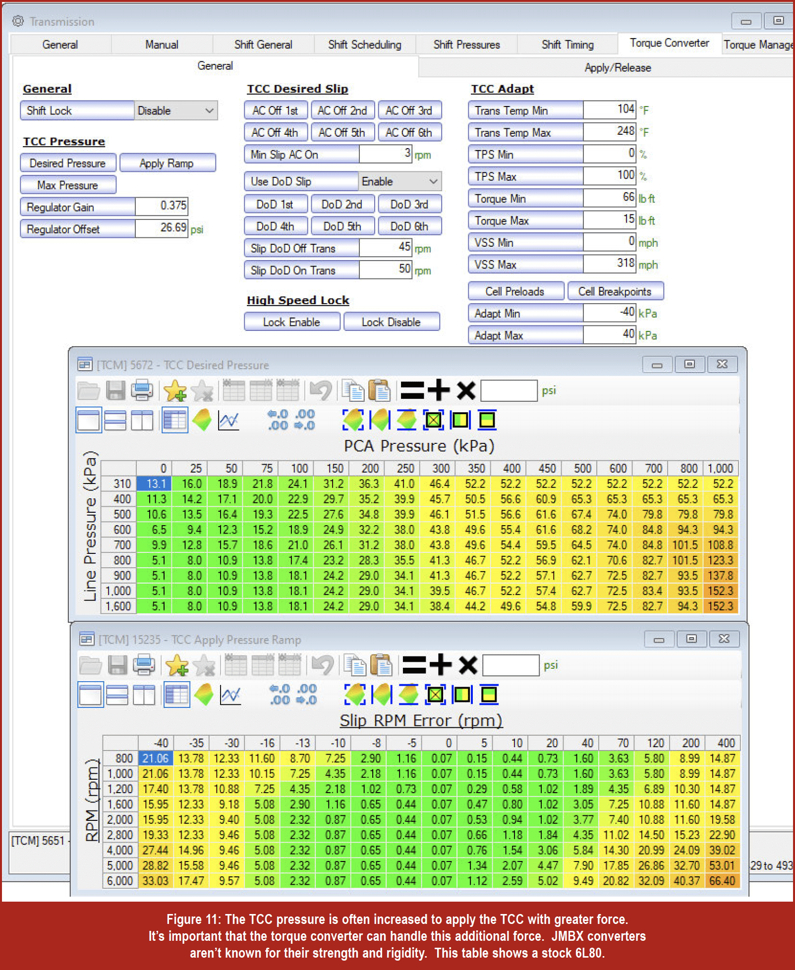 It’s also common for tuners to increase the lockup pressure by adjusting the TCC “Desired Pressure.” The tuner can change the lockup pressure in relationship to commanded line pressure. The stock calibration attempts to keep the TCC pressure lower when line pressure increases to high levels. A tuner might increase these levels to help prevent TCC slip under heavy loads. Also, the tuner might alter the values in the “apply ramp” table to increase the pressure adjustment when slip error is detected. By adding pressure to the slip error table, the TCM will make greater pressure changes while trying to reduce TCC slip error. Keep this in mind when overhauling a transmission. If you know that the TCC pressures are going to be increased and the TCC will be applied during WOT, consider installing an upgraded converter with a billet cover and piston. When engine power is greatly increased, look into a multi-clutch setup to handle the additional torque.