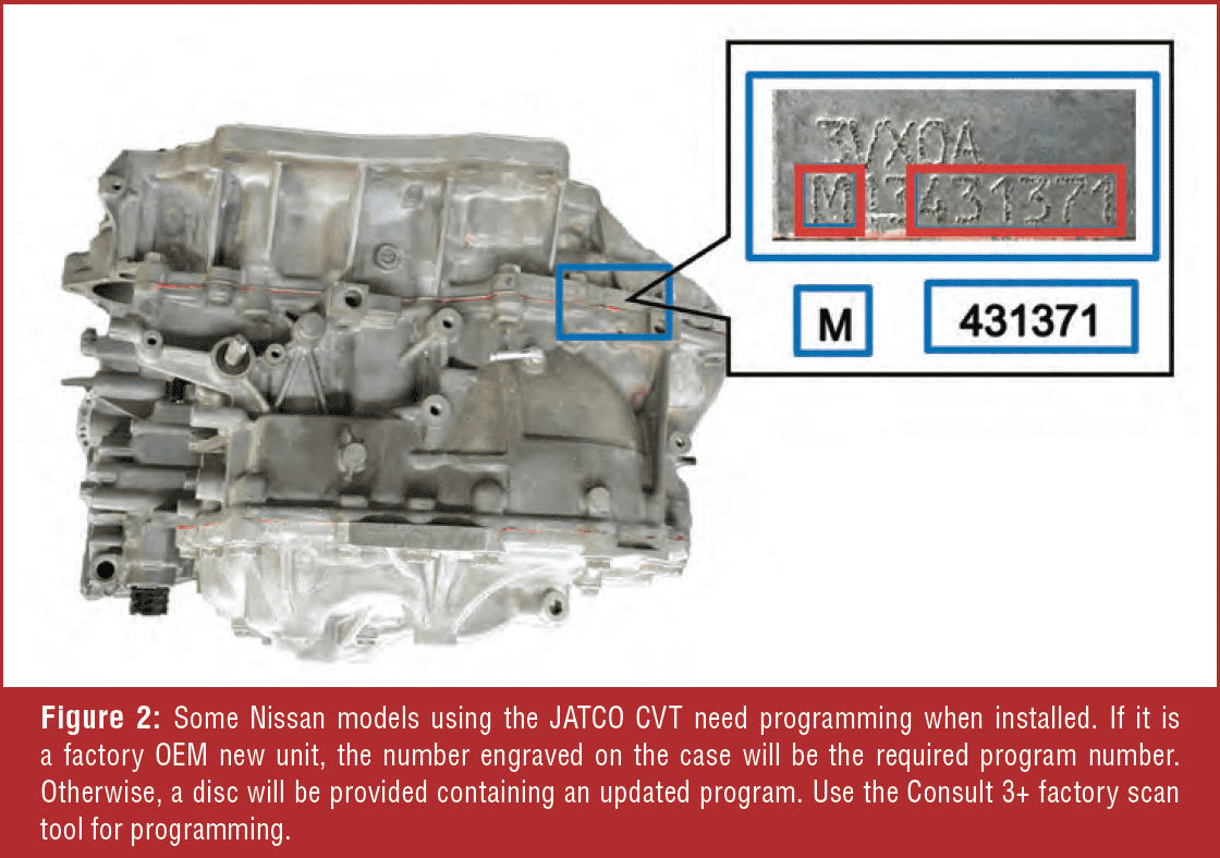 Some of these units need programming when installed. If it is a factory OEM new unit, the number engraved on the case will be the required program number (figure 2). Otherwise, a disc will be provided containing an updated program. Use the Consult 3+ factory scan tool for programming as needed.