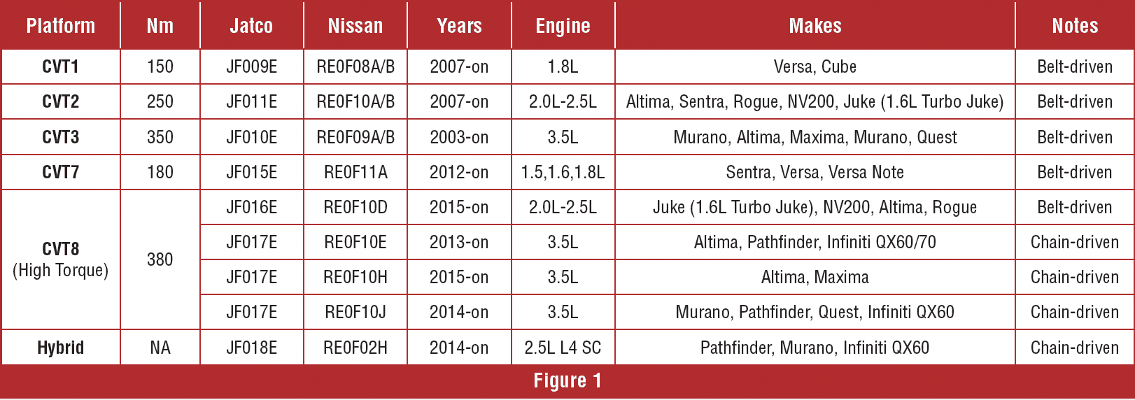 But if you look at the history and the commitment, you’ll see that JATCO is dedicated to CVT advancement. Nissan/Infiniti JATCO CVT platform lineup consists of CVT 1-X and are as follows: