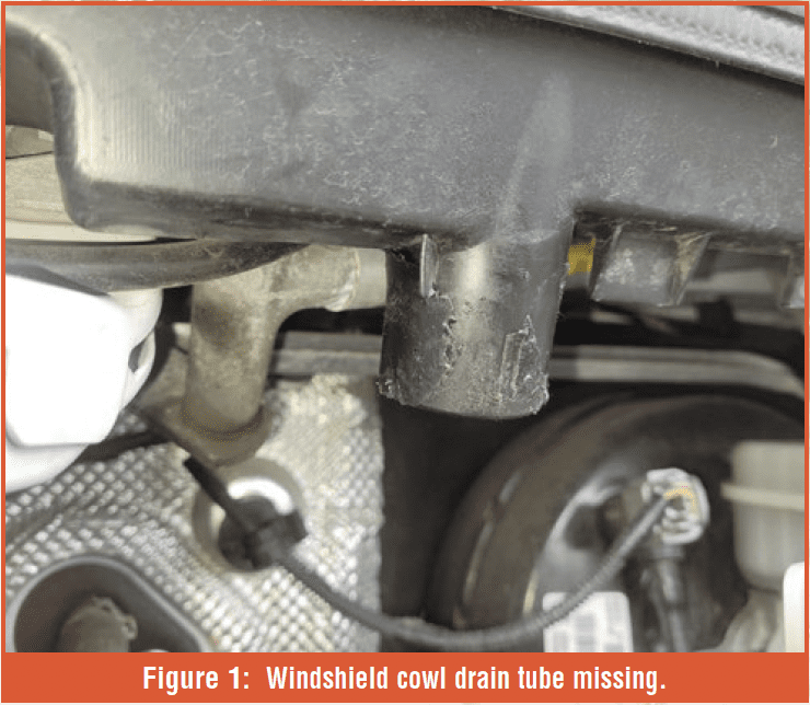 The owner indicated that it had previously been at a local repair shop for an engine repair. We inspected the engine compartment area and found the windshield cowl drain tube was missing (Figure 1), allowing the windshield cowl to drain directly onto the transmission vent. We ordered a new drain tube (part # 68445329AA) from our local dealer. According to the dealership parts department, the drain tube would take a couple of days to arrive. With the source of the water intrusion confirmed, we removed the transmission assembly for repair/rebuild.