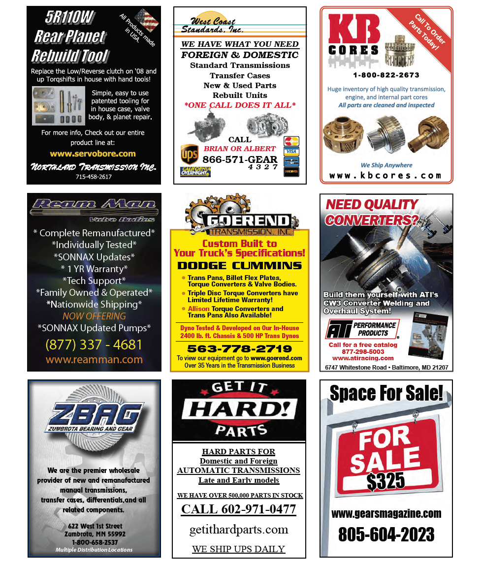 GEARS Staff Share This! Facebook Twitter Pinterest LinkedIn Shoppers and Classified | December - 2015 Shoppers and Classified March 6, 2015138 Views You may also like On the Road | April - 2018 Bypass the TIPM to Test Code P0882 March 30, 2018David Chalker115,824 Views Delivering the Goods | July - 2020 TIPM Problems! Intermittent Fail Safe, Codes, Related Concerns and Solutions June 30, 2020Keith Clark113,085 Views Other Articles | September - 2020 The More You Know About The 10R80… The Better Off You Are! September 1, 2020GEARS Staff78,434 Views Other Articles | January/February - 2020 The ZF 8-Speed Transmission Fluid and Filter Change January 16, 2020Guest Author64,011 Views Share This! Facebook Twitter Pinterest LinkedIn More In Shoppers and Classified Shoppers and Classified | April - 2026 Shopper Ads GEARS Staff18 Views Shoppers and Classified | March - 2026 Shopper Ads GEARS Staff25 Views Shoppers and Classified | January/February - 2026 Classified Ads GEARS Staff47 Views Shoppers and Classified | December - 2025 Shopper Ads GEARS Staff47 Views Shoppers and Classified | November - 2025 Shopper Ads GEARS Staff33 Views Popular Columns ATRA +A+ Money MattersM Hi-RevM What's WorkingM Up Your BusinessM Shop ProfileM Back on the BenchT Delivering the GoodsT Keep Those Trannys RollingT Street SmartT Fun With TransmissionsT Other ArticlesO VIEW ALL Social Media