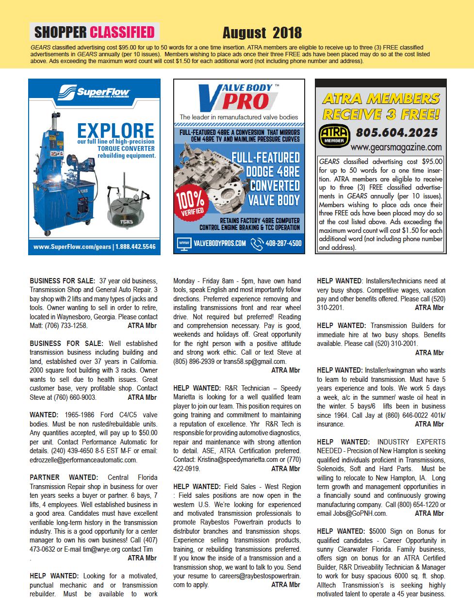 GEARS Staff Share This! Facebook Twitter Pinterest LinkedIn Shoppers and Classified | August - 2018 Shoppers and Classified August 1, 2018228 Views You may also like On the Road | April - 2018 Bypass the TIPM to Test Code P0882 March 30, 2018David Chalker115,824 Views Delivering the Goods | July - 2020 TIPM Problems! Intermittent Fail Safe, Codes, Related Concerns and Solutions June 30, 2020Keith Clark113,085 Views Other Articles | September - 2020 The More You Know About The 10R80… The Better Off You Are! September 1, 2020GEARS Staff78,434 Views Other Articles | January/February - 2020 The ZF 8-Speed Transmission Fluid and Filter Change January 16, 2020Guest Author64,011 Views Share This! Facebook Twitter Pinterest LinkedIn More In Shoppers and Classified Shoppers and Classified | April - 2026 Shopper Ads GEARS Staff18 Views Shoppers and Classified | March - 2026 Shopper Ads GEARS Staff25 Views Shoppers and Classified | January/February - 2026 Classified Ads GEARS Staff47 Views Shoppers and Classified | December - 2025 Shopper Ads GEARS Staff47 Views Shoppers and Classified | November - 2025 Shopper Ads GEARS Staff33 Views Popular Columns ATRA +A+ Money MattersM Hi-RevM What's WorkingM Up Your BusinessM Shop ProfileM Back on the BenchT Delivering the GoodsT Keep Those Trannys RollingT Street SmartT Fun With TransmissionsT Other ArticlesO VIEW ALL Social Media