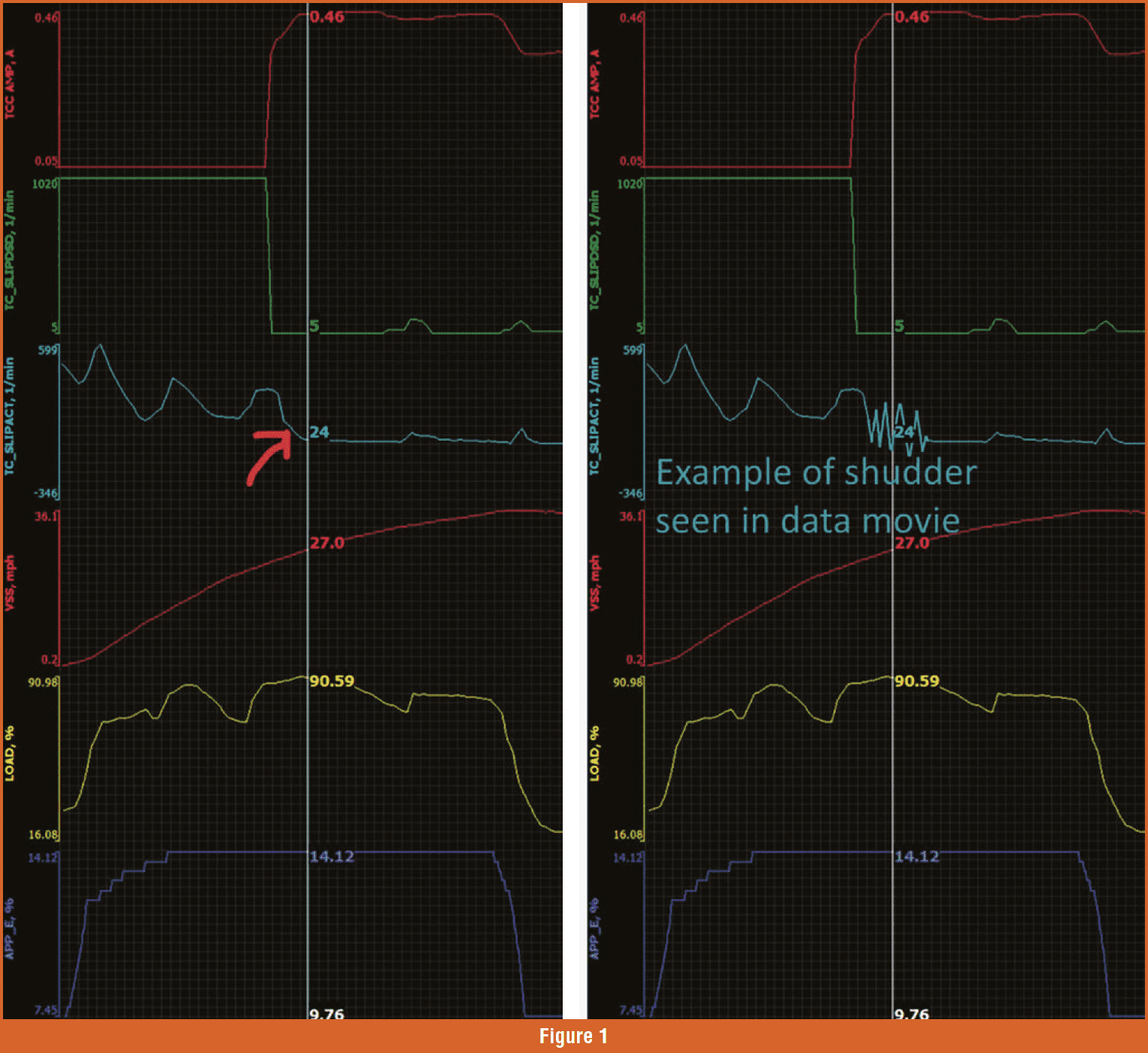 At this point, it would be best to hook up the scan tool and capture a movie of the transmission data stream at the speed the shudder happens (figures 1 and 2). Your focus should be on TCC commanded slip and TCC actual slip. To verify everything remained steady and did not influence the readings above, I would add TCC solenoid amps to verify the electrical signal and VSS, TPS%, and engine load% to verify those remained steady. If you abruptly changed the throttle input or the engine load changed dramatically in that section of the movie, I would look at a more stable, different section of the recorded movie.