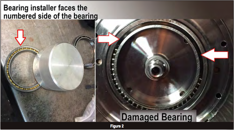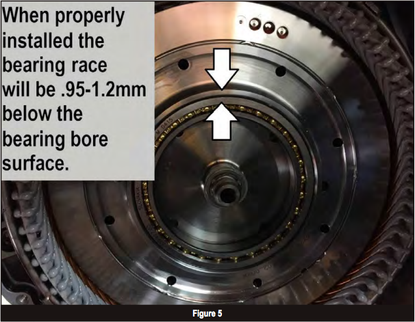 - Install a new bearing onto the rotor using the appropriate tools. Make sure to place the side of the bearing with the part number facing your bearing driver tool. Drive the bearing into its bore until the bearing outer race is 0.95–1.2mm (0.037”–0.047”) below the bearing bore. (Figure 5)