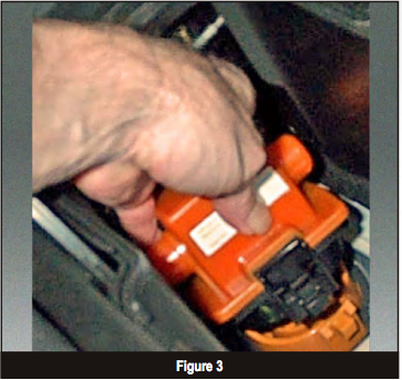 Next, you’ll want to disconnect the vehicle’s 12-volt battery. Then disconnect the high voltage disconnect plug, located in the center console armrest area. Wait five minutes or more for the capacitors in the inverter to discharge. (Figure 3)