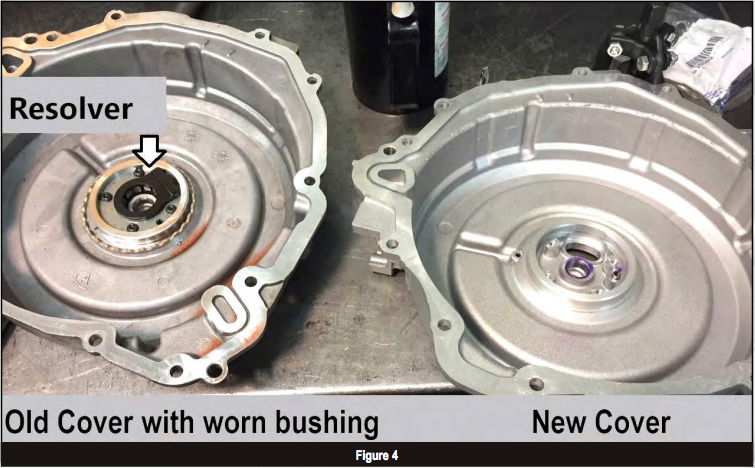 - Inspect the side cover bushing for evidence of damage. If the cover bushing, bearing mounting area, or resolver (stator position sensor) are damaged, you’ll also need to replace the side cover, and replace or transfer the resolver from the old cover. (Figure 4)