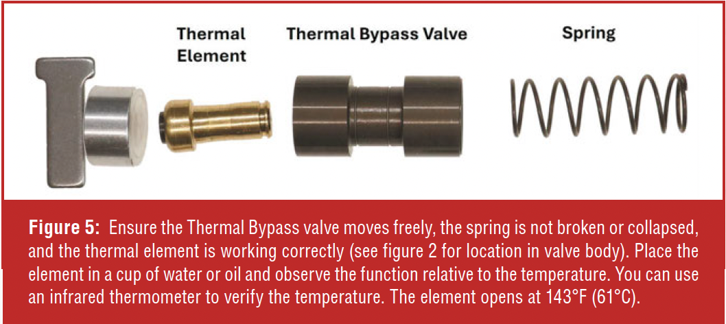 Transmission overheating is another concern. The thermal bypass valve can stick, or the element can fail (Figure 5). It is not recommended to disable the thermal bypass valve in this transmission. Remove, clean, and inspect. Test the thermal element to ensure that it expands and contracts at the recommended temperature range. Repair and replace as necessary.