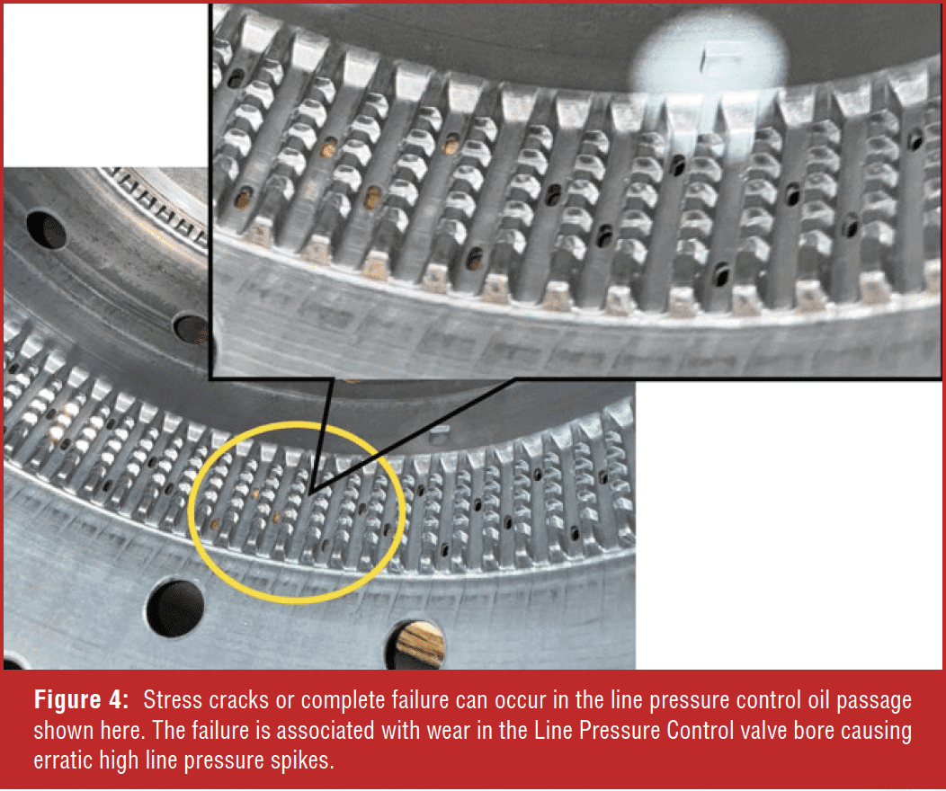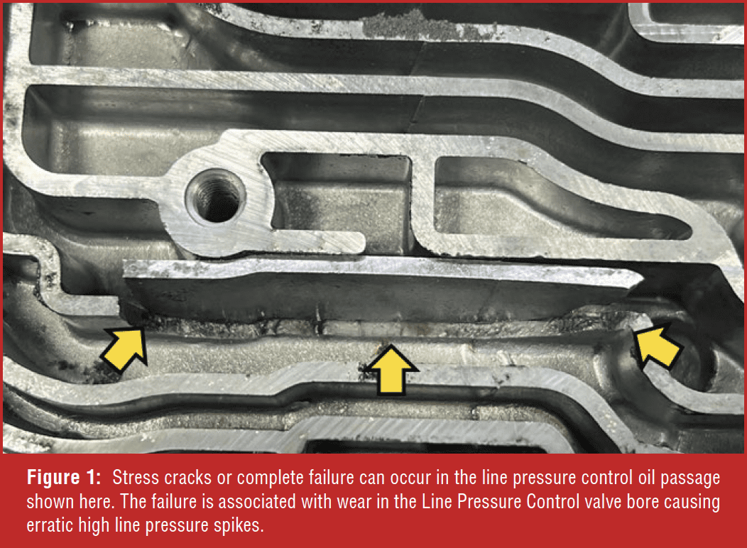 Unstable line pressure tops the list of items of concern inside the valve body. The main line pressure regulator bore wears, which creates a loss of accurate control of line pressure at the EPC Solenoid, resulting in high line pressure spikes. The high line pressure spikes can crack , or break valve body passages (Figure 1). Always inspect early valve body castings for cracked or failing passages. Temperaturesensitive faults, such as binding in reverse or harsh/erratic shifts that only occur when the unit is hot but work well when cold, usually indicate a cracked valve body. GM has updated the casting with thicker passage walls. Note that there is currently no firstor second-generation variant for the 10L1000.