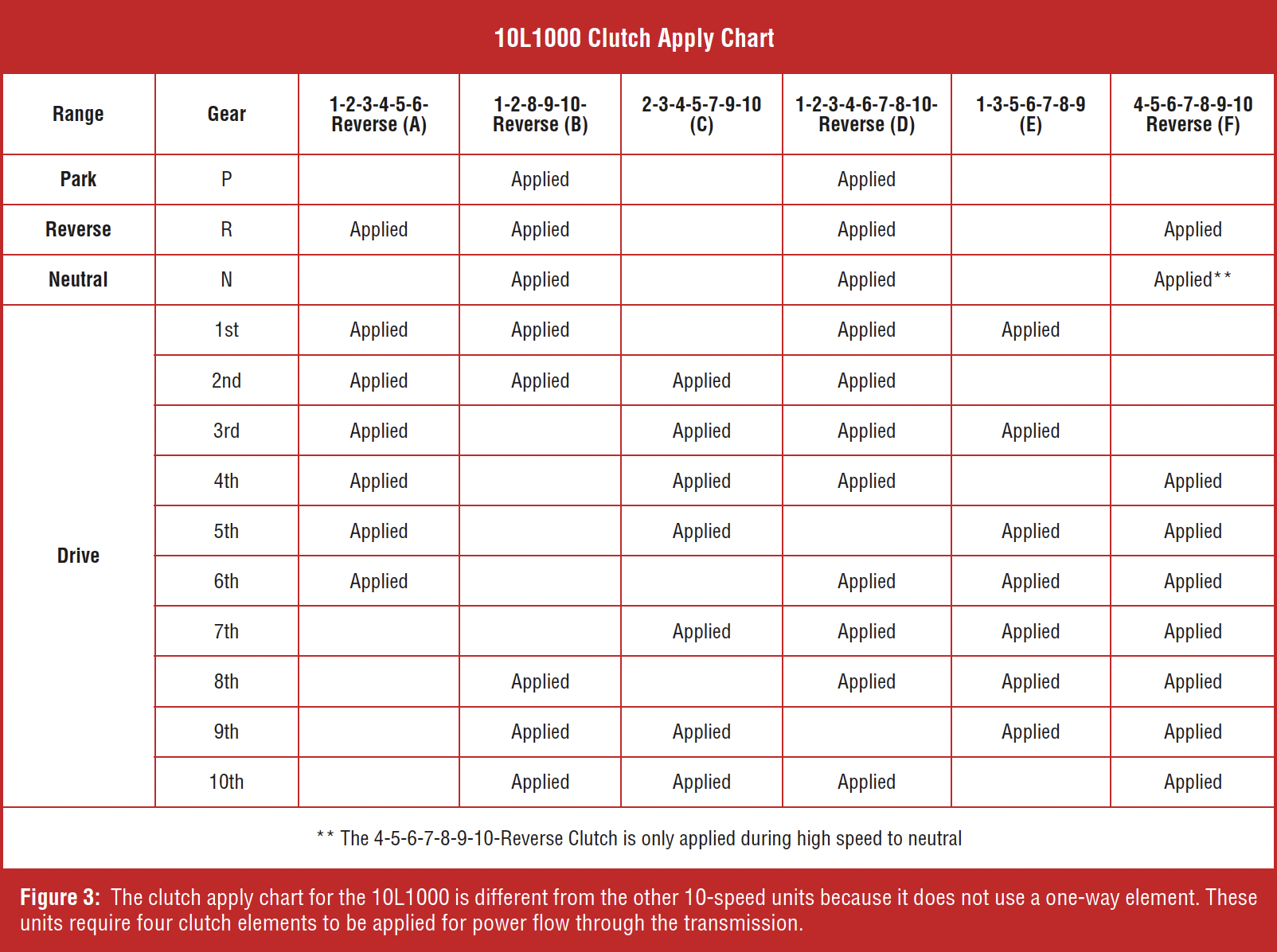 As mentioned earlier, failing internal parts can cause erratic shift quality issues. Use the clutch apply chart to help isolate mechanical faults (Figure 3). Keep in mind that this unit requires four clutch components to be applied for power flow. So, if you’re diagnosing for a bind or movement in neutral, you should look for a clutch that should not be applied. The following concerns may indicate internal component damage or failure: