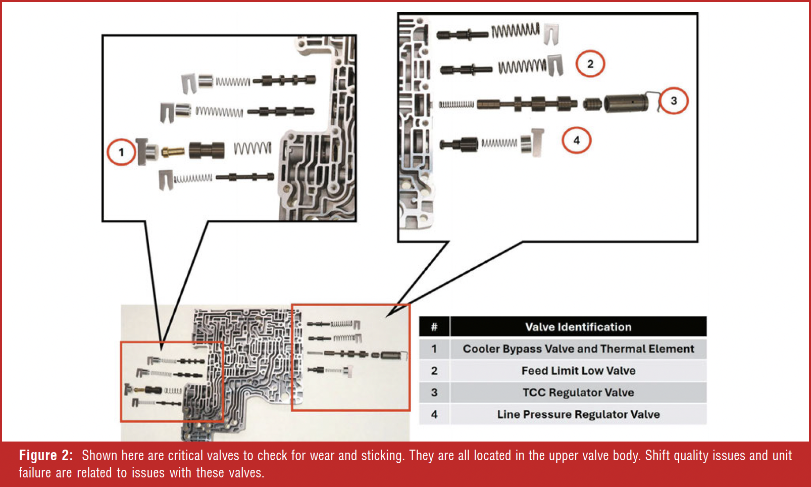 Broken or weak solenoid retaining clips plague this unit. If you are servicing the valve body or rebuilding the unit and using the original valve body, always replace the solenoid retaining clips. There are OEM and aftermarket solutions to service the retaining clips. If the vehicle had erratic shifts or other shift quality-related concerns, and the solenoid retaining clips were loose or broken, thoroughly inspect the area of the valve body closest to the valve for excessive wear. The linear pintle solenoids are pulsewidth modulated and oscillate on and off to move the hydraulic clutch control valve mechanically. Oscillation can create a vibration and movement of the solenoid body, causing wear in the valve bore area. If excessive wear is observed, the valve body needs to be replaced.