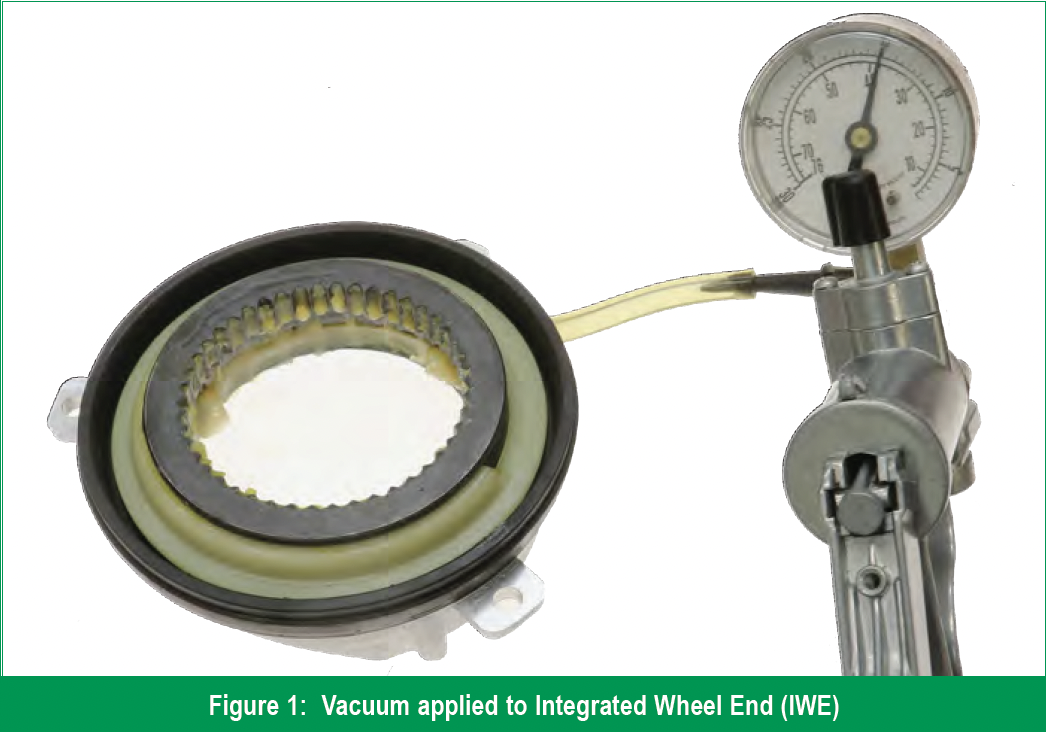 With the vehicle on the rack, inspect the front differential and front hubs. Spin the front wheels to locate the failed hub. Check the AWD vacuum system going to the front differential. With the engine running, there should be close to 17” of vacuum at the right front hub. With the engine off, the vacuum should bleed down after a few minutes. To test the system internally, use a vacuum pump directly to the IWE fitting. While spinning the wheel and apply and release the vacuum going to the IWE. If there is a noise that occurs on either hub during the vacuum test, it fails the leak down test. This is an indication that the IWE has an internal problem.