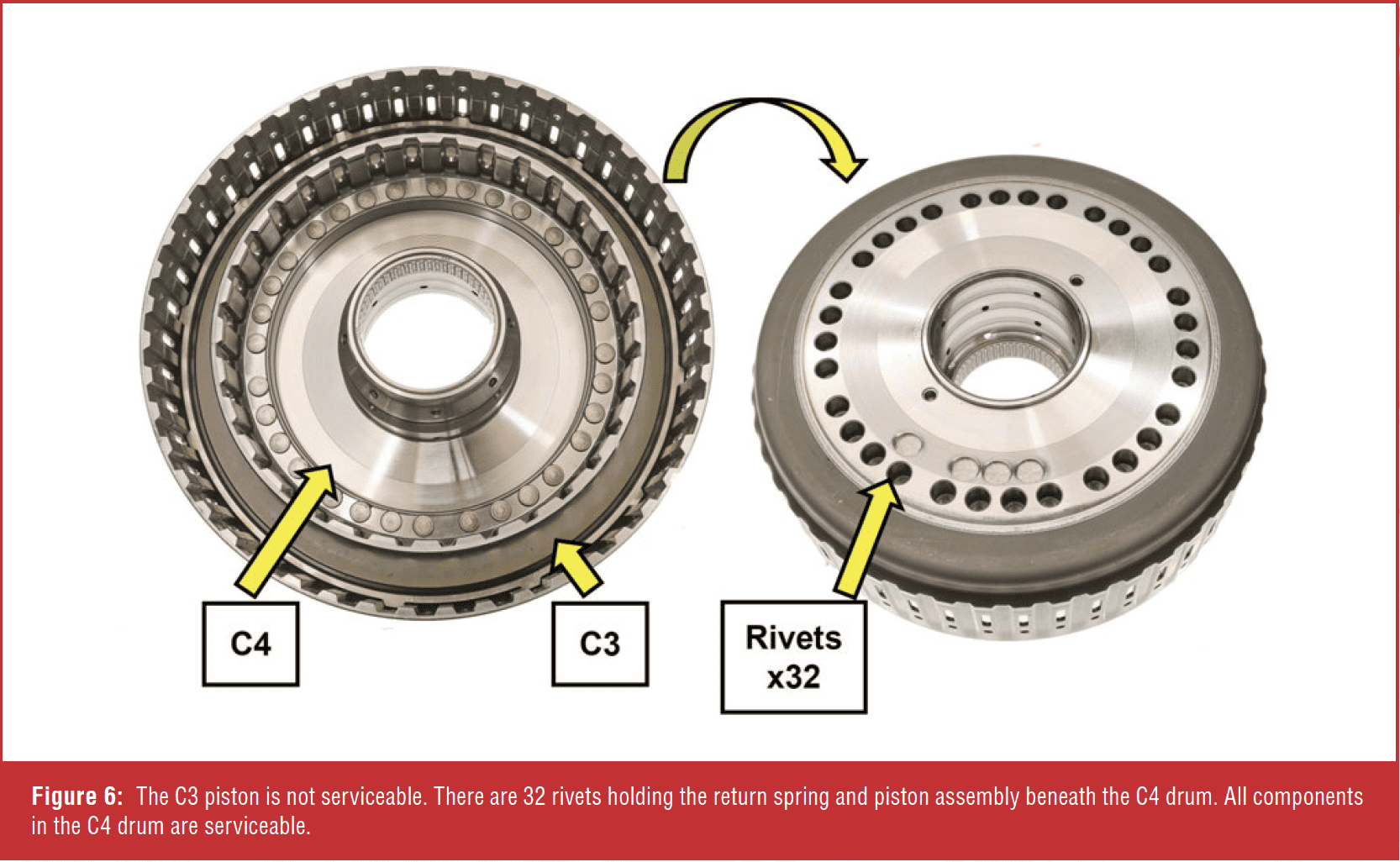 Another critical item to be aware of while inside this unit is the C3/C4 drum. The C3 piston and return spring are assembled and riveted in place (Figure 6). Thirty-two rivets are holding this drum assembly together, making it difficult for the aftermarket to come up with a solution to service the C3 piston. A new replacement drum from Toyota costs just shy of $2,300 US (part number 34610-48030). Used drums are available online in the neighborhood of $450US dollars, but beware of the source and condition of the assembly.
